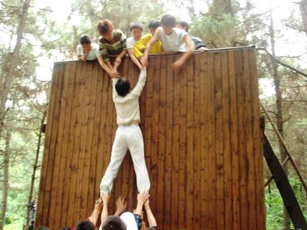 在“泰坦尼克号”的环节中,所有同学分为两队,要求所有同学不借助任何工具,翻越高达4米高的墙板。既要保障全体同学的安全,又要有速度。为了能顺利跨越4米高的障碍物。所有同学抢做人梯,甘愿为其他同学的成功翻越做基石。做人梯要承受相当的载荷,而且不能出现晃动,否则人梯上面的同学就有摔落的危险。“我行、我能行、我们一定行”,这句嘹亮的口号响彻活动的全过程,不光男同学,就连女同学也甘愿伏地给其他同学搭台阶。正式这种舍小我顾大家的团队精神,造就了较快的一队20人仅以9分钟的时间就全部顺利翻越了4米的障碍。