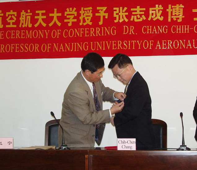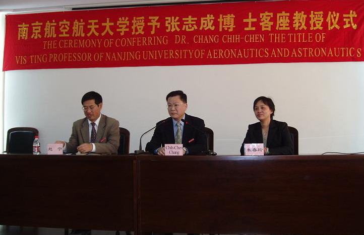 2007年10月18日下午,在航空宇航学院学术报告厅,香港科技大学土木工程系Chih-Chen Chang(张志成)教授受聘为我校客座教授,航空宇航学院科研副院长朱春玲教授主持了受聘仪式,航空宇航学院院长赵宁教授代表王福平校长致词,并代表学校向张志成教授颁发了客座教授聘书、校徽。
