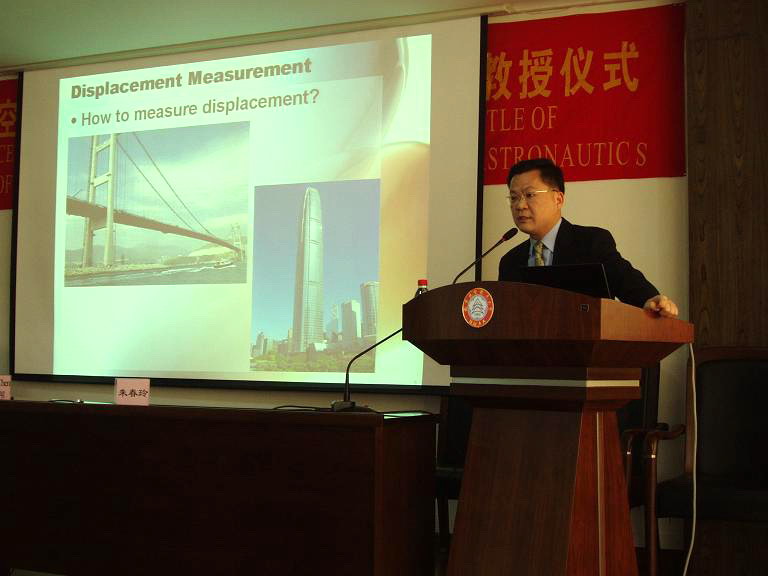 仪式结束后,张志成教授作了题为“Vision-based Structural Vibration Measurement”的精彩学术报告。报告内容新颖、丰富、生动,阐明影像显示技术的最新发展方向。张志成教授结合自己多年的研究成果,讲述了影像测量方法中需注意的若干问题以及今后的研究方向。这些技术资料对解决我校在振动测试、系统辨识与损伤诊断研究方面所遇到的技术难题有很大的帮助,对我校今后的相关研究很有借鉴推动作用。航空宇航学院结构强度研究所周丽教授主持了报告会。全校师生百余人参加了报告会。