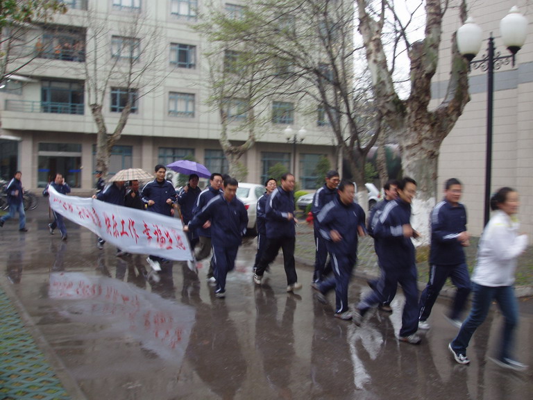 虽然下着绵绵细雨,但操场上人头攒动,个个摩拳擦掌,一脸兴奋。四点十分,随着发令枪声响,长跑队伍出发了。我院在大旗的引导下,教职工们个个精神抖擞地向前冲去。长跑的队伍中,有一马当先的院领导,有50多岁的老教师,有年富力强的中青年教师,更有精神饱满的青年教工。大家迈着整齐的步伐、相互鼓励,不少员工还互相“打气”,手拉着手、互相搀扶着跑完全程……现场气氛显得热烈而温馨,一路上充满了阵阵欢声笑语。途中,队伍的响亮口号,此起彼伏,引来沿途群众赞赏的目光。置身其中,一种强烈的集体荣誉感和凝聚力在大家心中温暖地流淌。