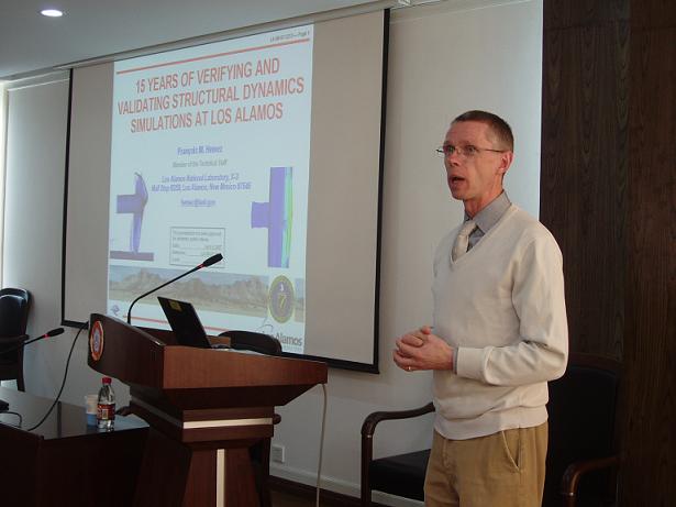 在我校访问期间,François Hemez博士还与与航空宇航学院及机电学院的部分教师和研究生进行了学术座谈。双方还就今后学术合作的可行性进行了探讨,并各自表达了愿意深入交流合作的意愿,其中包括Hemez博士再次来访,并在复杂结构动力学计算仿真,不确定性量化,以及模型确认等方面进行合作研究,并协助指导研究我校研究生。