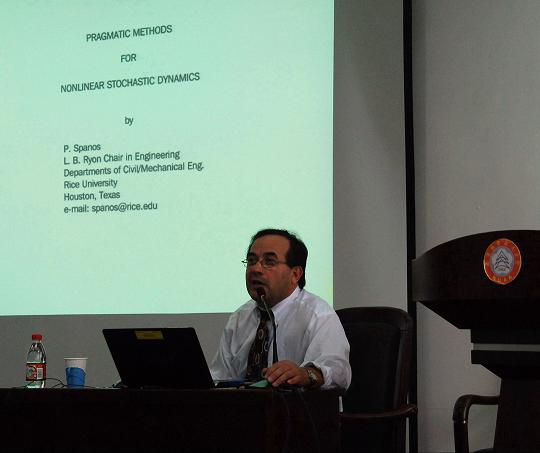 Pol D. Spanos教授,美国工程院院士,著名国际结构动力学专家。1976年美国加州理工学院获得应用力学博士学位,1988年至今任莱斯大学(Rice University)机械工程和土木工程的L.B. Ryon讲座教授。分别于1990年和1991年当选美国机械工程师学会和土木工程师学会会员,1994年当选美国力学学会会员,1999年当选美国Alexander von Humboldt协会终生会员,2003年当选希腊国家科学院通讯院士,2005年当选美国工程院院士。现任国际著名SCI期刊International Journal of Non-Linear Mechanics和Probabilistic Engineering Mechanics主编。编写了18本著作、论文集;发表300余篇学术论文,其中SCI收录130余篇。主要研究方向为多种载荷作用下结构的动力行为与可靠性预测、性能与安全评估、数字信号处理、参数识别等,研究领域涉及结构工程、地震工程、航空航天工程、海洋工程、石油工程、生物医学工程等。