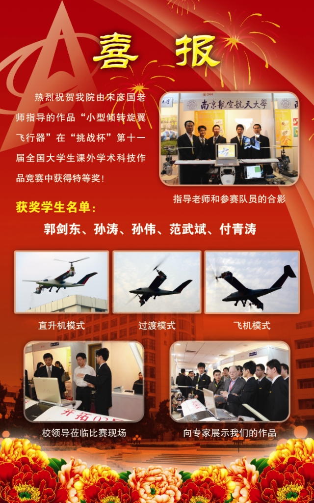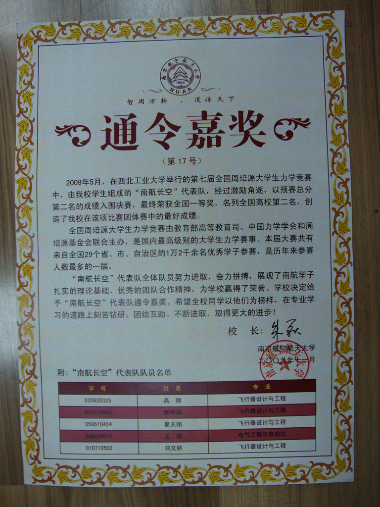 朱荻校长为在十一届“挑战杯”全国大学生课外学术科技作品竞赛终审决赛中荣获团体总分第三名的全体参赛队员颁发了第18号嘉奖令。我院由宋彦国老师指导的作品“小型倾转旋翼飞行器”在竞赛中获得唯一一项特等奖。我院获得嘉奖的学生有:郭剑东、孙涛、孙伟、范武斌、付青涛。