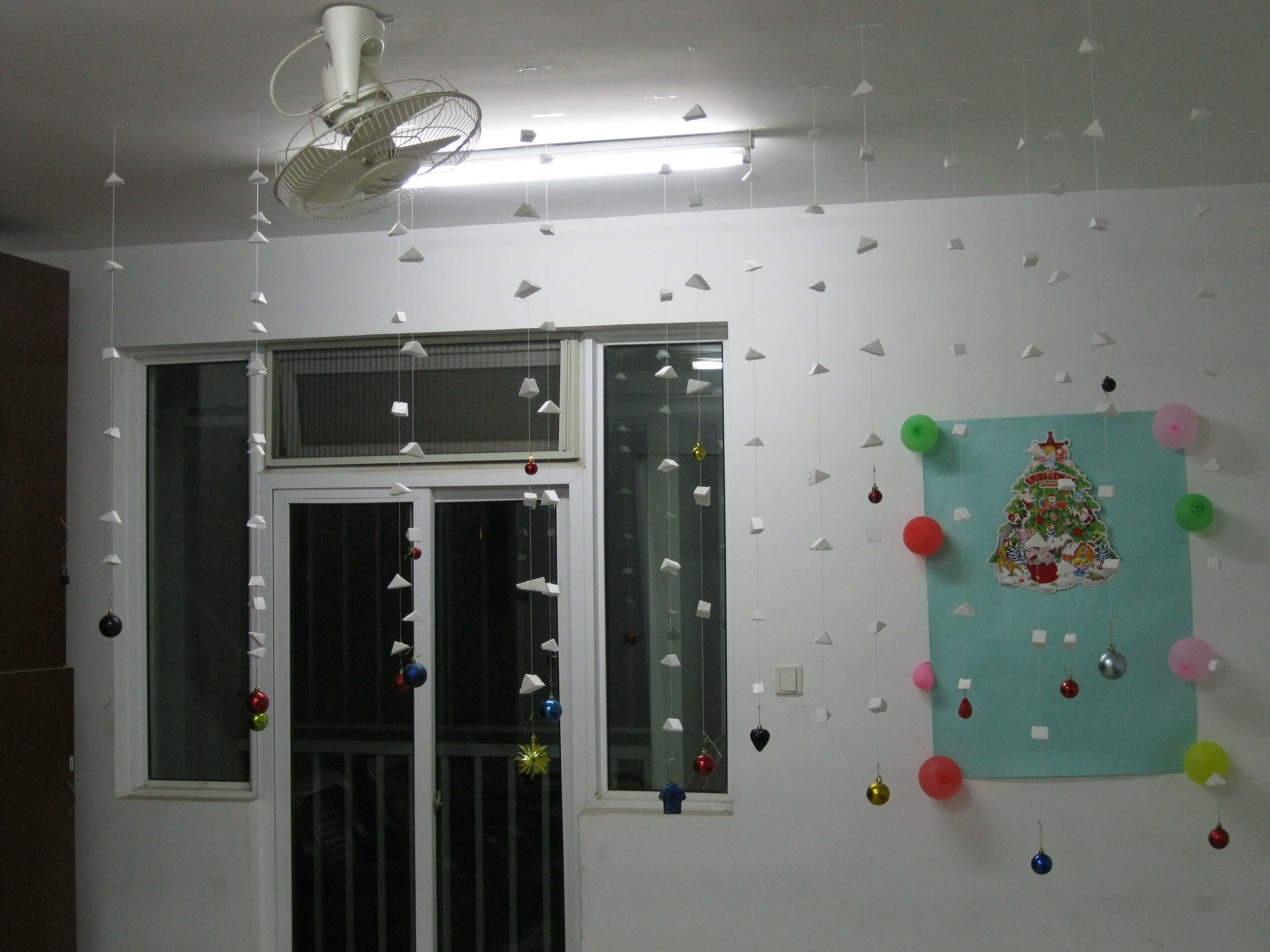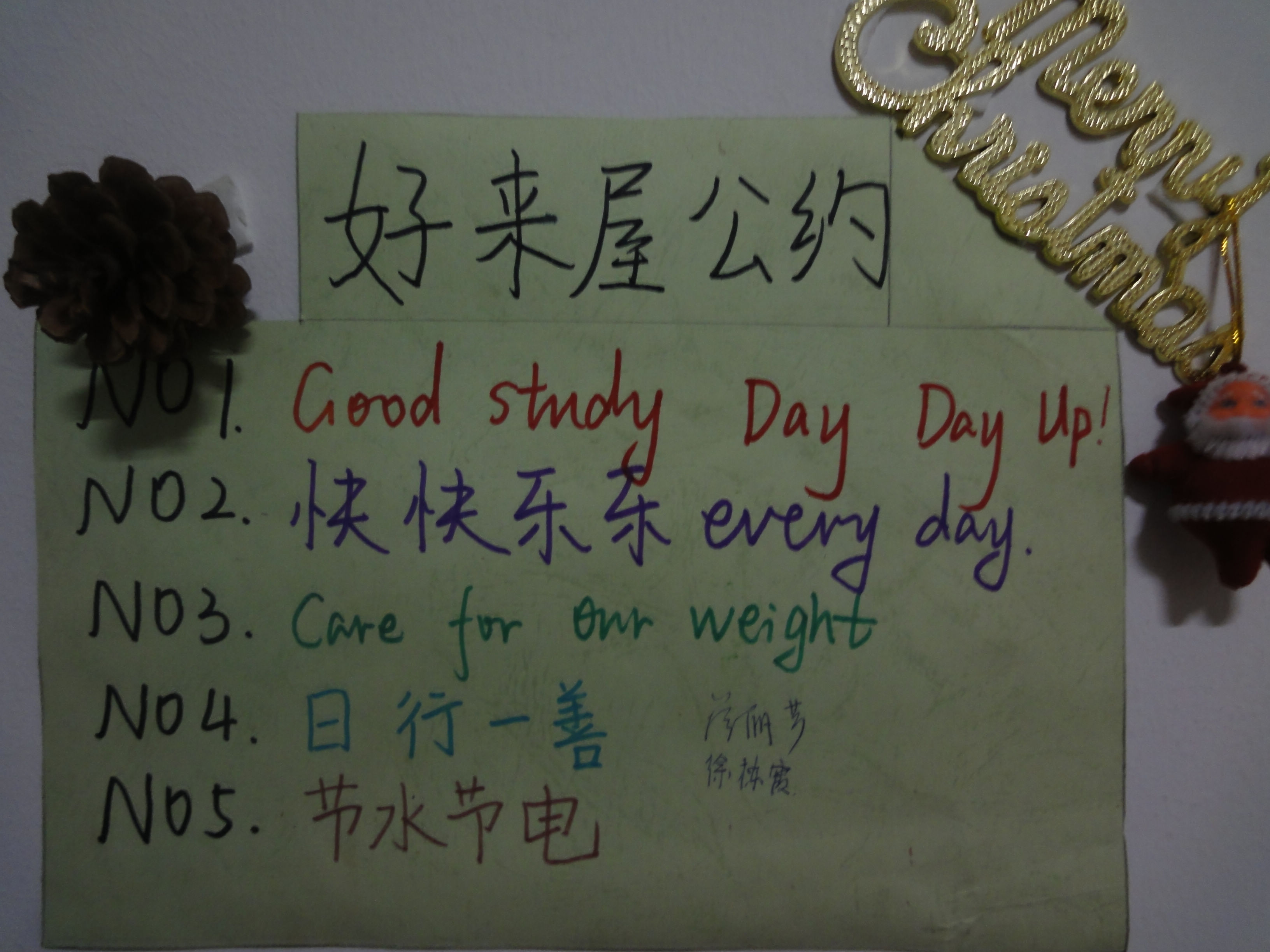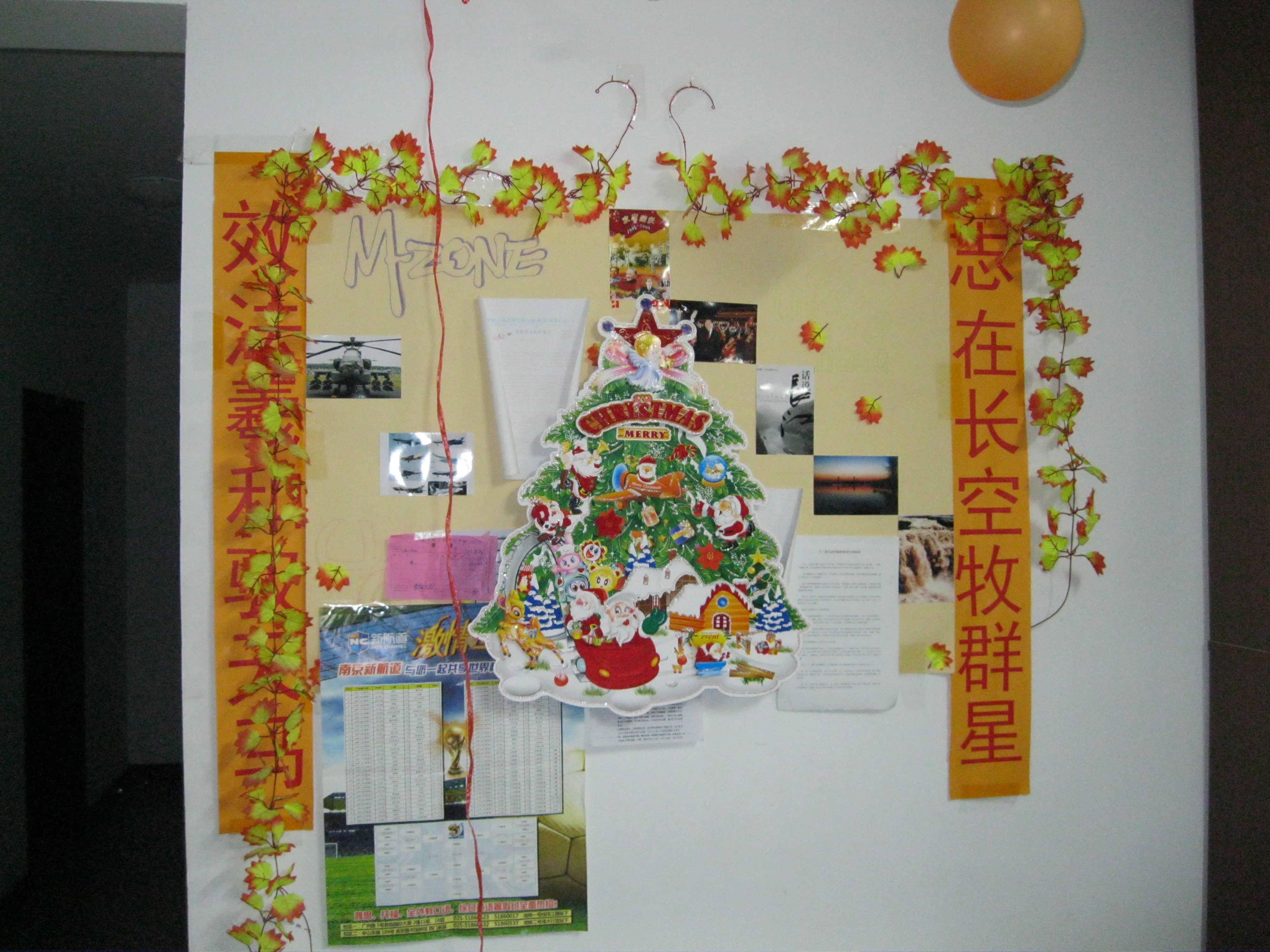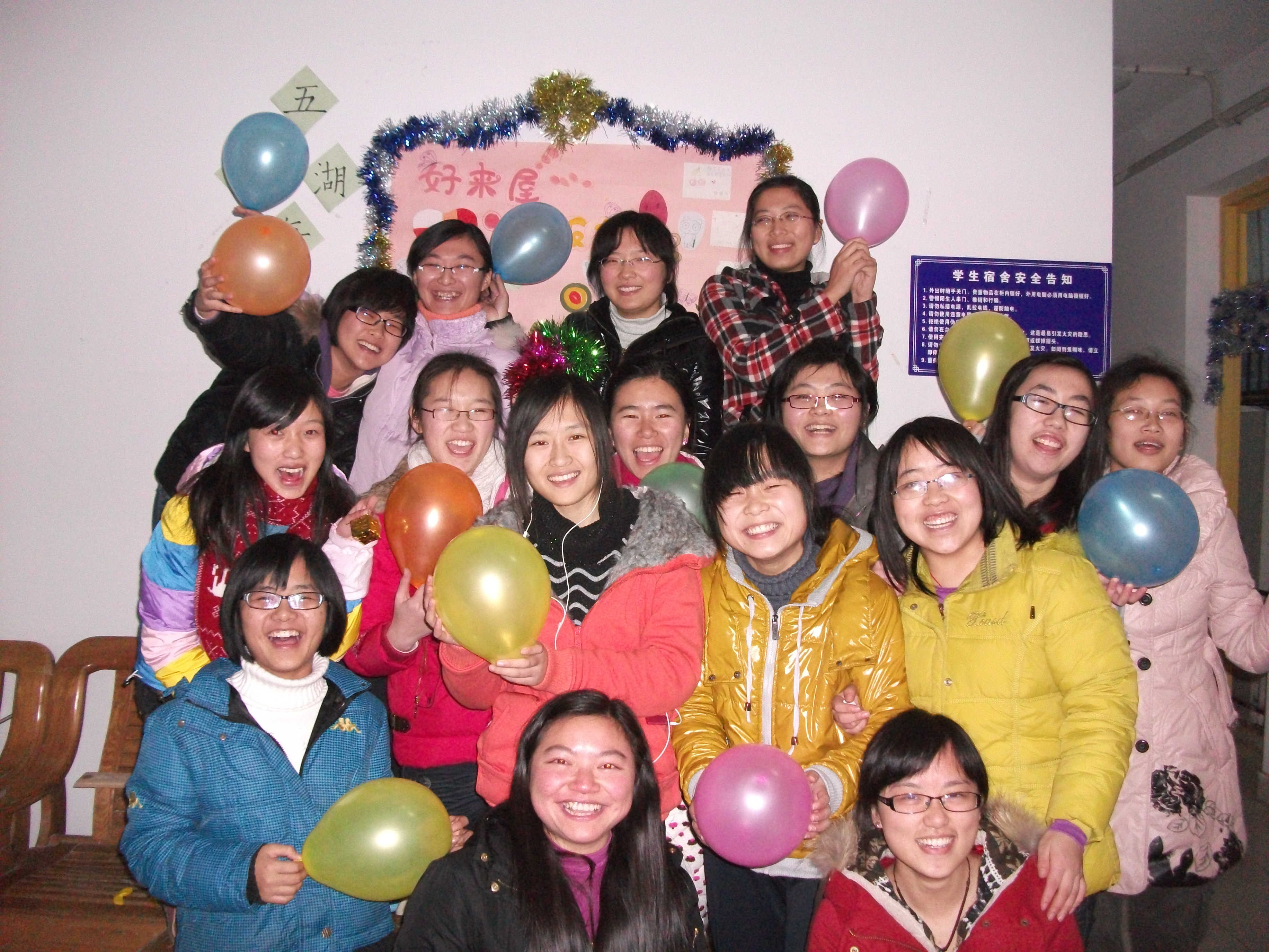 在中心组的组织和宣传下,各个寝室都积极地行动起来。首先,每个寝室听取寝室成员的建议,集思广益,精心设计舍名和舍训,力求不仅要足够吸引眼球、琅琅上口,而且蕴涵哲理,用以自勉和催人奋进。除了响亮的舍名和舍训外,更重要的是布置寝室。趁着圣诞节来临之际,大家在宿舍门口贴上了精美的圣诞老人贴画,在客厅挂上了各种装饰,营造出一种其乐融融、温馨的氛围。更有的寝室充分发挥自己的想象力,对宿舍进行了个性化的设计和装扮,很明显地突出了自己的特色,从而在比赛中吸引了评委更多的目光,赢得了一致的称赞和高分。