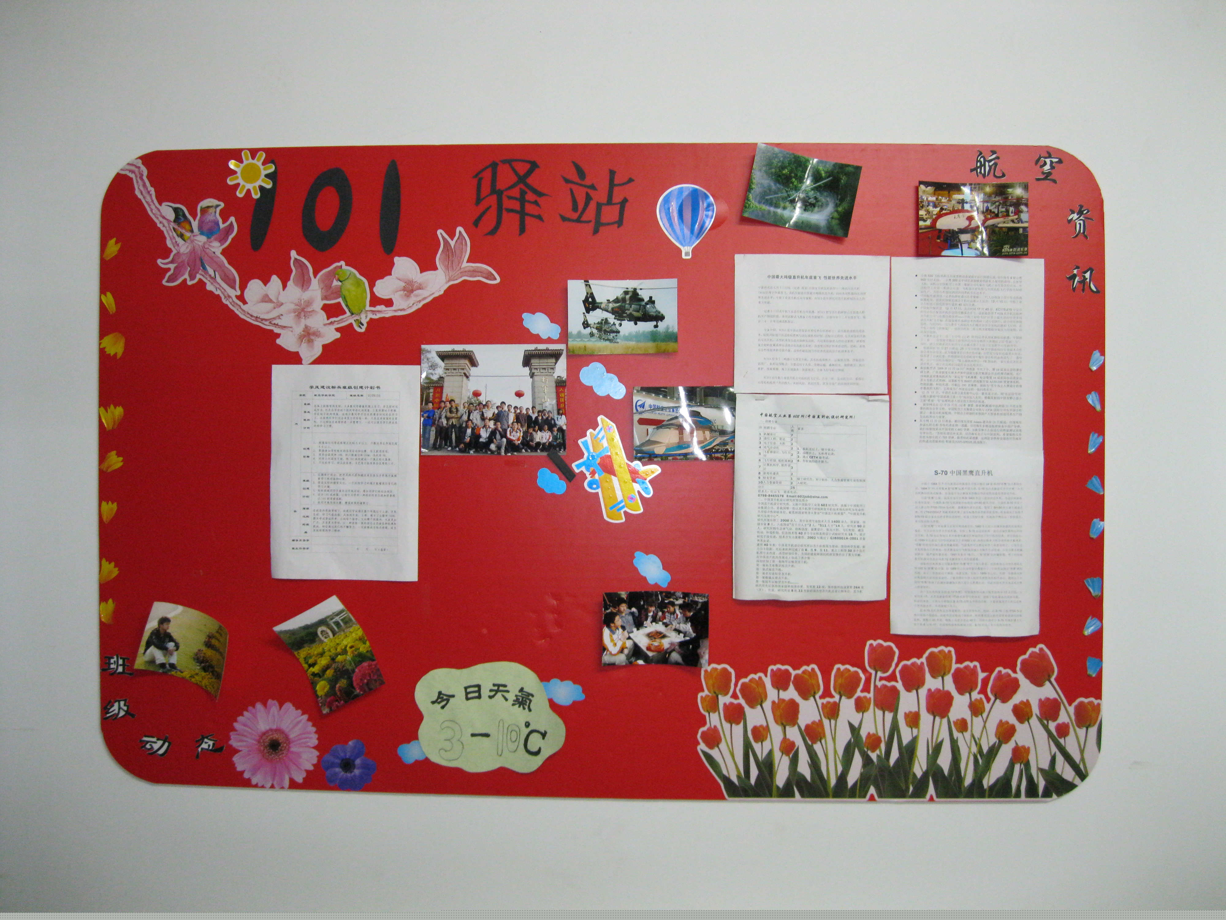 这次活动中不得不提的就是各大寝室的墙纸海报了。这些海报大多手绘,充分反映了同学们心灵手巧。海报上贴有大家裁剪的贴花、寝室照片以及手工绘画,有的还有每天更新的天气预报和小常识。