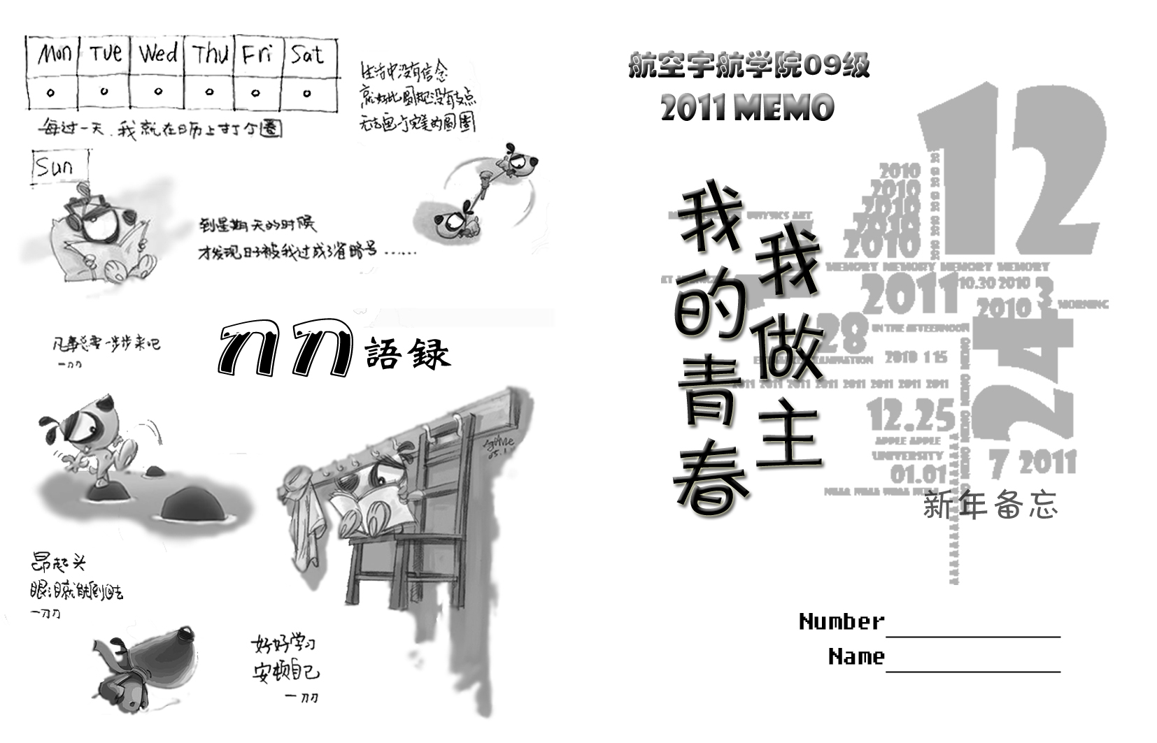 在09级团总支下发的“新年备忘”中,“2010 memory”力求让学生回忆2010年中最开心、最感谢、最怀恋、最杯具……的那些故事,这些故事需要同学们在回忆整理后妥善保存,作为大学中成长的印记。“2011 dream”则希望学生树立关于2011的梦想,关于学习的,关于爱情的,关于家人的,更有关于未来的……最后还将进行“讲出我的2010故事会”和“梦想交流”两个环节,鼓励学生主动表达,展示自我风采。