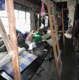 我悄悄地溜进了农民工住宿的工棚,(上中图为偷拍的工棚内景)要不是亲眼所见,我真的不相信这个地方也可以住人。外面是随意堆放的工程材料,地面上的积水变成了黑绿色。通过一个破败的木门,我进入了工棚。屋内又黑又暗,窗户很小,没有玻璃,只有一些塑料布挡在窗口上。工人的床铺使用施工使用的板材搭成的,分上下两层,上下铺用梯子相连。好几个人挤在一张大木板上。工棚里垃圾随处可见,让人作呕。