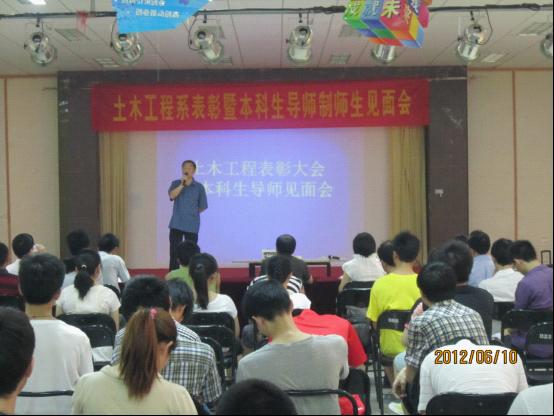 2012年6月10日上午土木工程系在江宁校区艺术中心召开本科生表彰暨导师制师生见面会。航空宇航学院党委李明成书记、童明波副院长、院团委储瑾蓉书记、各年级辅导员、土木工程系全体教师及本科生参加了会议。李明成书记和童明波副院长向荣获全国大学生混凝土设计大赛团体二等奖的景宪杭、刘媚和罗承浩同学及优秀指导教师耿飞颁发了奖状和奖金,并发表了热情洋溢的讲话。书记和院长勉励土木系师生继续努力再创辉煌。土木系系主任陈少林教授宣布2011级本科生导师制名单,导师和学生进行了面对面的交流。