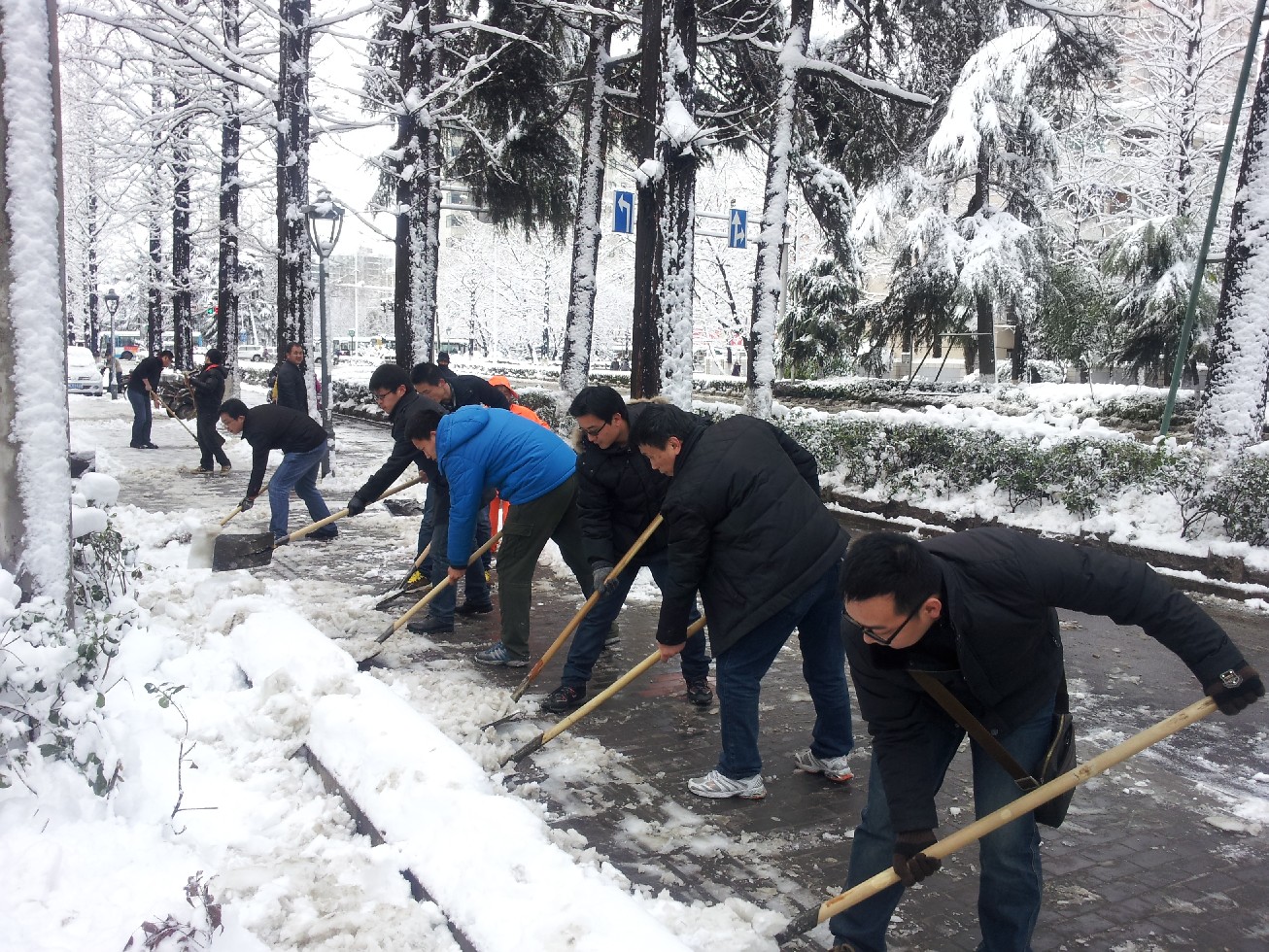 2月18日,南京普降大雪,给市民和师生的生活带来很多不便。学院根据假期前学校扫雪预案工作安排,学院领导及时组织安排相关工作。19日一早给全院师生群发短信提示安全出行。上午8点多,学院部分青年教师和研究生来到校外清扫五龙桥至西大门责任范围积雪,大家热情高涨,特别是我院几位教师路过时,主动要求加入扫雪队伍,很快就完成扫雪工作,方便了市民出行,获得路过市民的称赞。