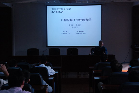 访问期间黄院士做了题为“可伸展电子元件的力学”的学术报告,详细介绍了他与合作者近年来在柔性电子器件力学方面所取得的研究成果,以及在应变梯度理论及纳米力学等方面的研究工作,引起广大师生的浓厚兴趣。航空宇航学院院长赵宁教授主持了报告会,全校师生一百余人参加了报告会。