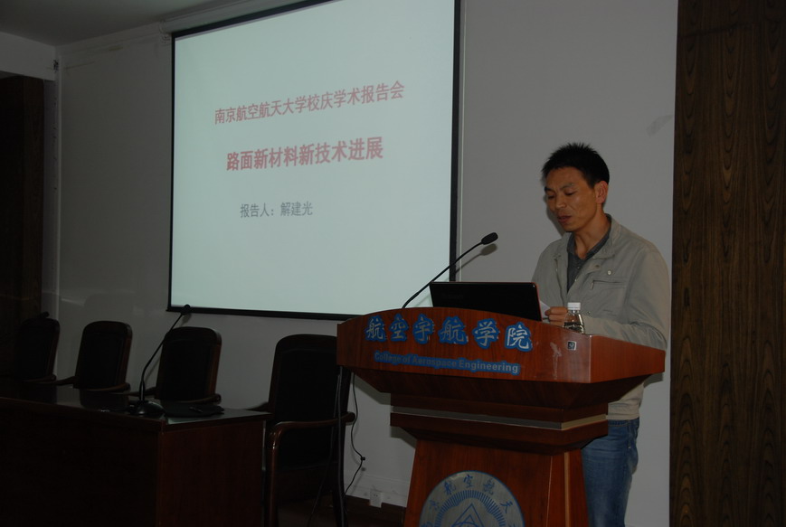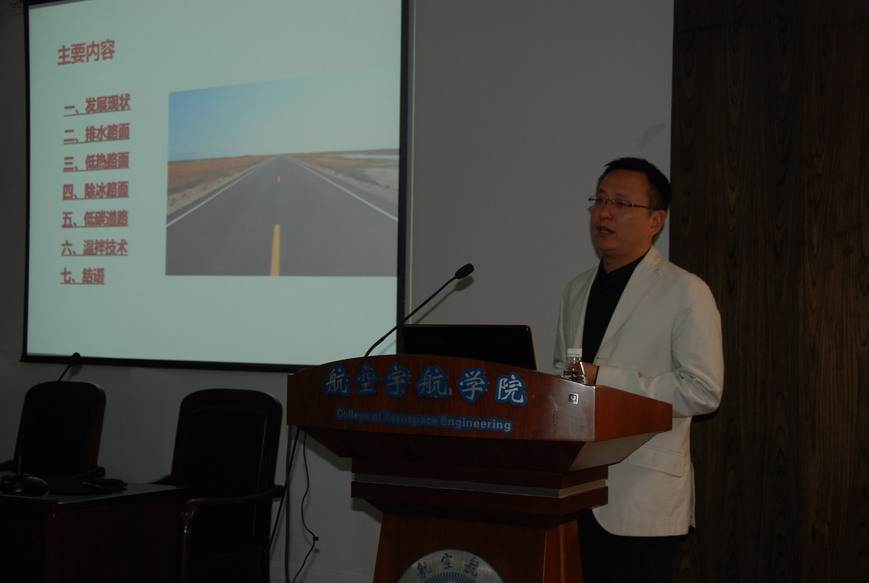 应校科协的邀请,航空宇航学院新晋教授解建光于2013年11月7日做了题为“路面新材料、新技术进展”的学术报告,报告详细介绍了排水降噪路面、低温路面、防冻路面、低碳路面等绿色环保路面新技术以及未来道路发展的方向,引起了与会师生的浓厚兴趣,师生们就一些学术问题与解建光教授进行了热烈的讨论。