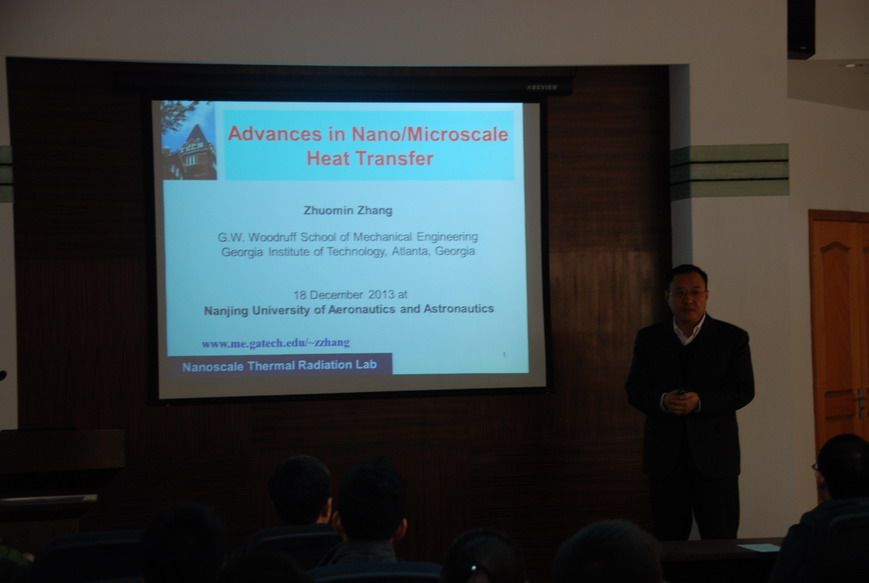 访问期间,张卓敏教授做了题为“Advances in Nano/Microscale Heat Transfer (微纳尺度传热进展)”的学术报告。报告综述了微纳尺度传热的发展历史和研究现状,分析了微纳尺度传热的特性和机理,讨论了微纳尺度传热的热点问题,并介绍了佐治亚理工学院在微纳尺度传热方面的研究成果。报告结束后,现场老师和学生就报告内容进行了积极讨论。张教授还参观了我校人机与环境工程实验室,并与方贤德教授课题组进行了深入座谈。