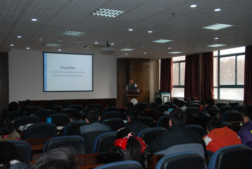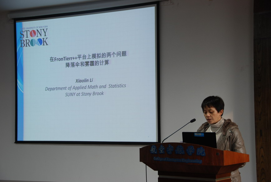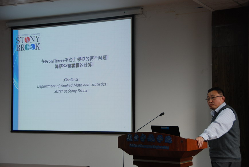 访问期间,李晓林教授做了题为“在FronTierr++平台上模拟的两个问题――降落伞和雾霾的计算”的学术报告。报告介绍了一种建立在弹簧三角网格上的新的降落伞建模,由此带来的数值理论问题和他们的解,以及在此基础上建立的降落伞计算模拟,它的数值收敛性以及对某些实验结果的验证;并介绍了大气水颗粒和其他颗粒的动态模拟,该模拟将可能加深对雾霾形成和它随各种大气参数变化的理解以及如何预测和控制,建立理论基础和计算平台。报告结束后,现场老师和学生就报告内容进行了积极讨论。航空宇航学院科研副院长朱春玲教授主持了报告会。