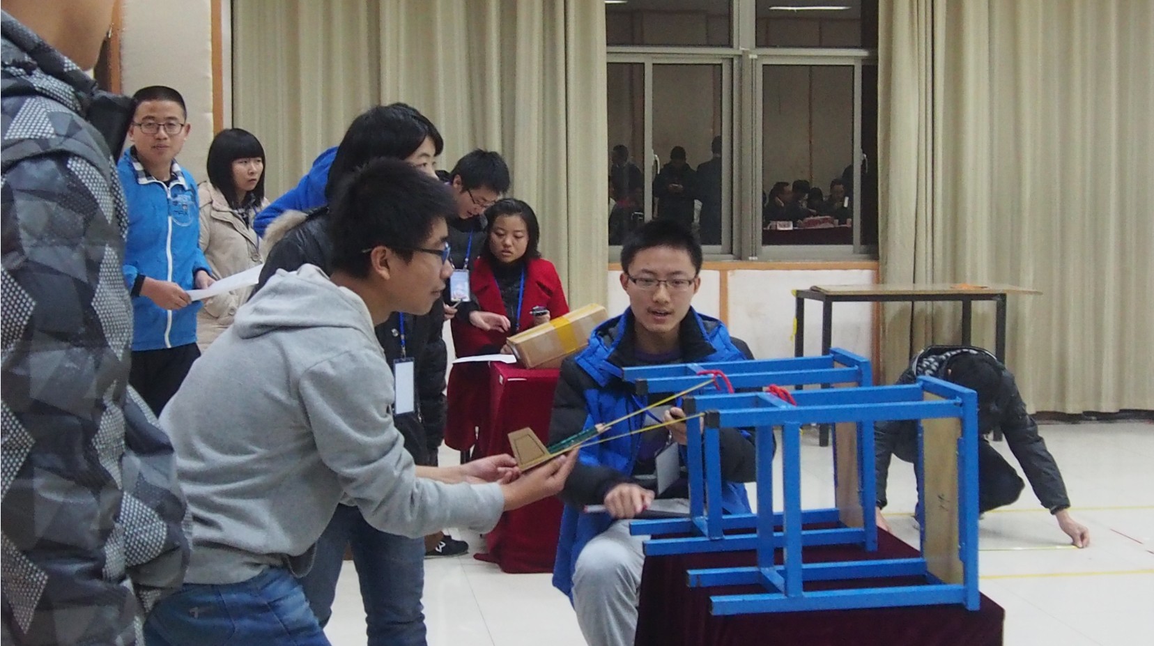 本次比赛吸引近450名学生报名参加。6日晚,各院13级70组参赛选手提前到达会场。他们紧张地试飞,对飞机做最后的微调。比赛正式开始后,每组参赛选手向评委老师介绍自己的团队作品,仔细讲解作品的设计理念与结构,并认真回答评委老师的提问。随后选手使用弹射装置弹射飞机,由工作人员测出飞机滑翔距离和偏航距离。比赛如火如荼地进行,有成功的击掌,也有失败的鼓励。