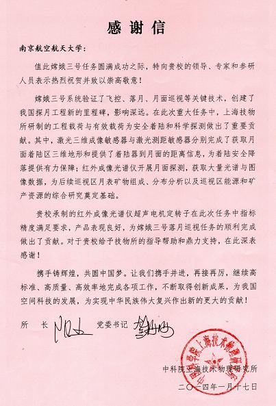 2014年 1月 17日,中国科学院上海技术物理研究所致信我校,感谢我校为嫦娥三号所作贡献。信中说,我校赵淳生院士团队承制的红外成像光谱仪超声电机定转子在此次任务中指标精度满足要求,产品表现良好,为嫦娥三号落月巡视任务的顺利完成做出了贡献。感谢信全文如下: