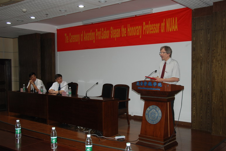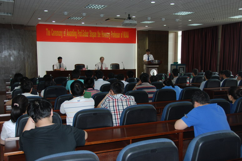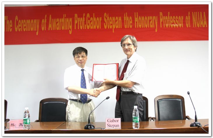 5月28日,我校举行了盖博・斯蒂芬教授名誉教授授聘仪式。校长助理熊克教授参加了聘任仪式,为盖博・斯蒂芬教授颁发了荣誉证书并佩戴了南航校徽。授聘仪式上,熊克对加盖博・斯蒂芬的到来表示热烈欢迎,向参会嘉宾及我校师生介绍了斯蒂芬的学术经历和学术成就,并感谢斯蒂芬过去在力学系统动力学与控制领域对我校的帮助与指导,希望并相信斯蒂芬授聘我校名誉教授后,两校能进一步加强国际学术交流,拓宽科研合作领域,联合培养优秀人才,最终提升我校力学学科在国际力学界的学术影响力。斯蒂芬对熊克的热情接待表示感谢,愿意积极为两校的合作搭建平台,促进我校相关学科的进一步提升和完善,推动布达佩斯工业与经济大学与我校的合作关系以及学科水平跃上新的台阶。此次来访,斯蒂芬将为我校学生开设半个月《Dynamics of Computer Control Machines》的英语课程。