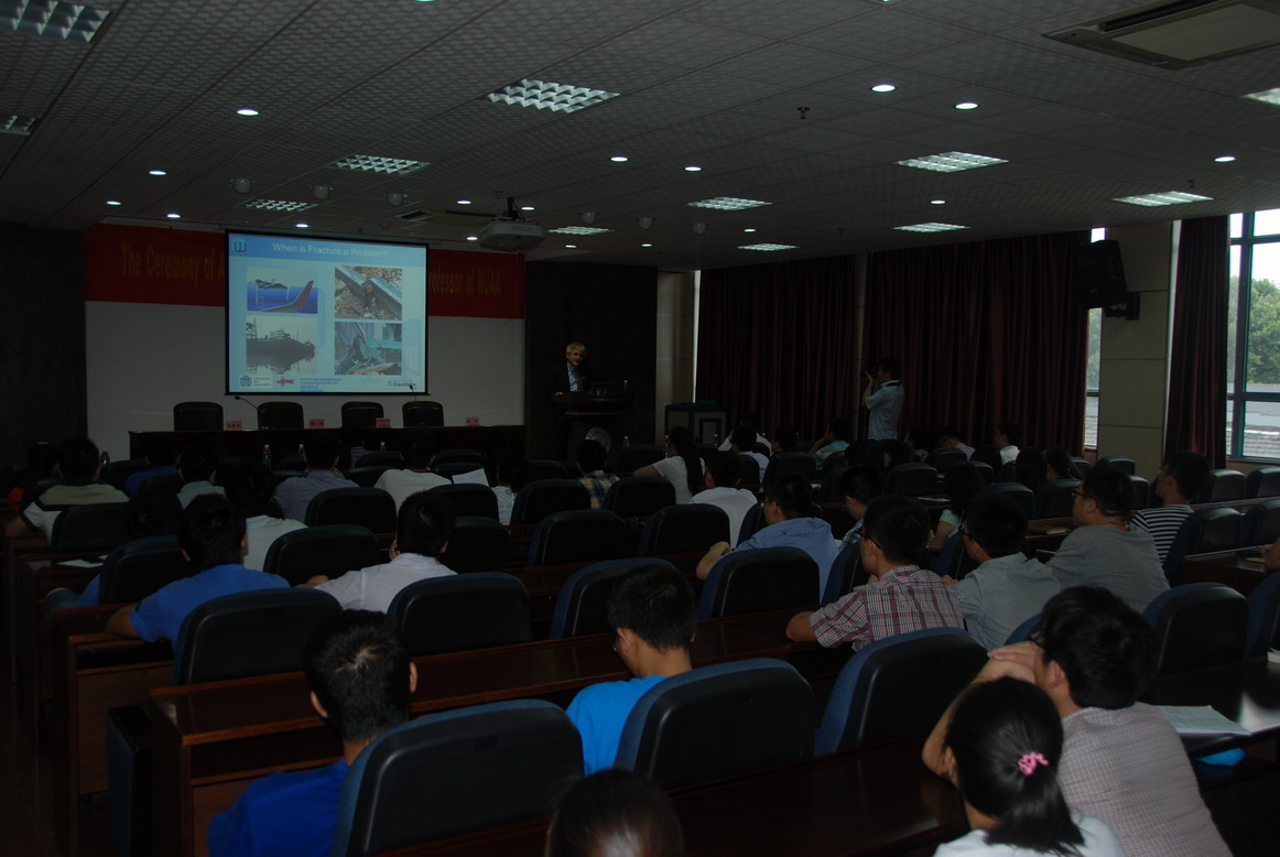 授聘仪式后,博勒教授为我校师生做了题为“Damage Tolerance from Aluminium to Concrete � Managing Engineering Structures a Smarter Way”的学术讲座,分别就基于损伤容限的结构设计准则和结构健康监测技术的发展及工程中的实际应用问题做了详细的阐述。