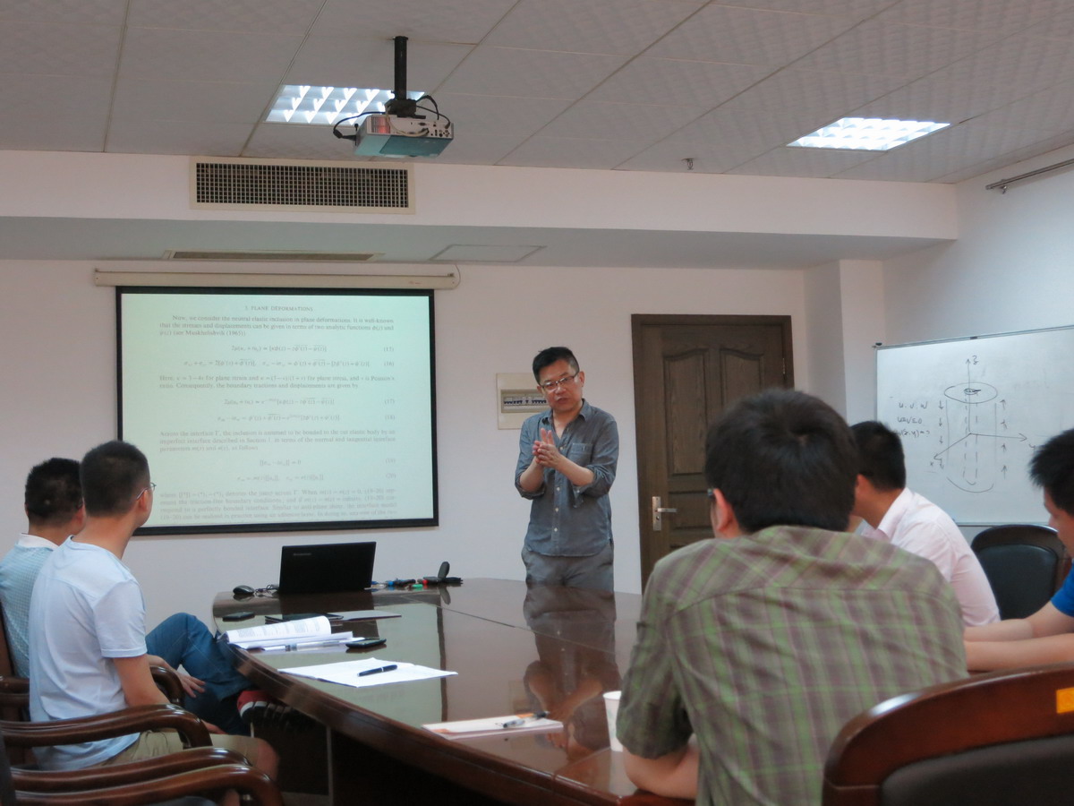 访问期间,Ru Chong-Qing教授为我校师生做了共52课时的“压电材料力学及其相关问题研究”系列学术讲座。讲座内容涉及压电复合材料有效介质理论及界面断裂力学,重点讲述了压电复合材料的有效性能预测以及界面裂纹高速扩展等问题。在其访问期间,Ru Chong-Qing教授与我院强度研究所师生开展了一系列的学术交流,加深了大家对于固体力学国际前沿领域的了解和认识。此外,Ru Chong-Qing教授还指导了2名研究生开展关于压电夹杂平面与反平面问题等方面的研究课题,并与高存法教授课题组合作开展有关Eshelby夹杂均匀应力场问题、压电材料动态裂纹扩展等问题的研究。