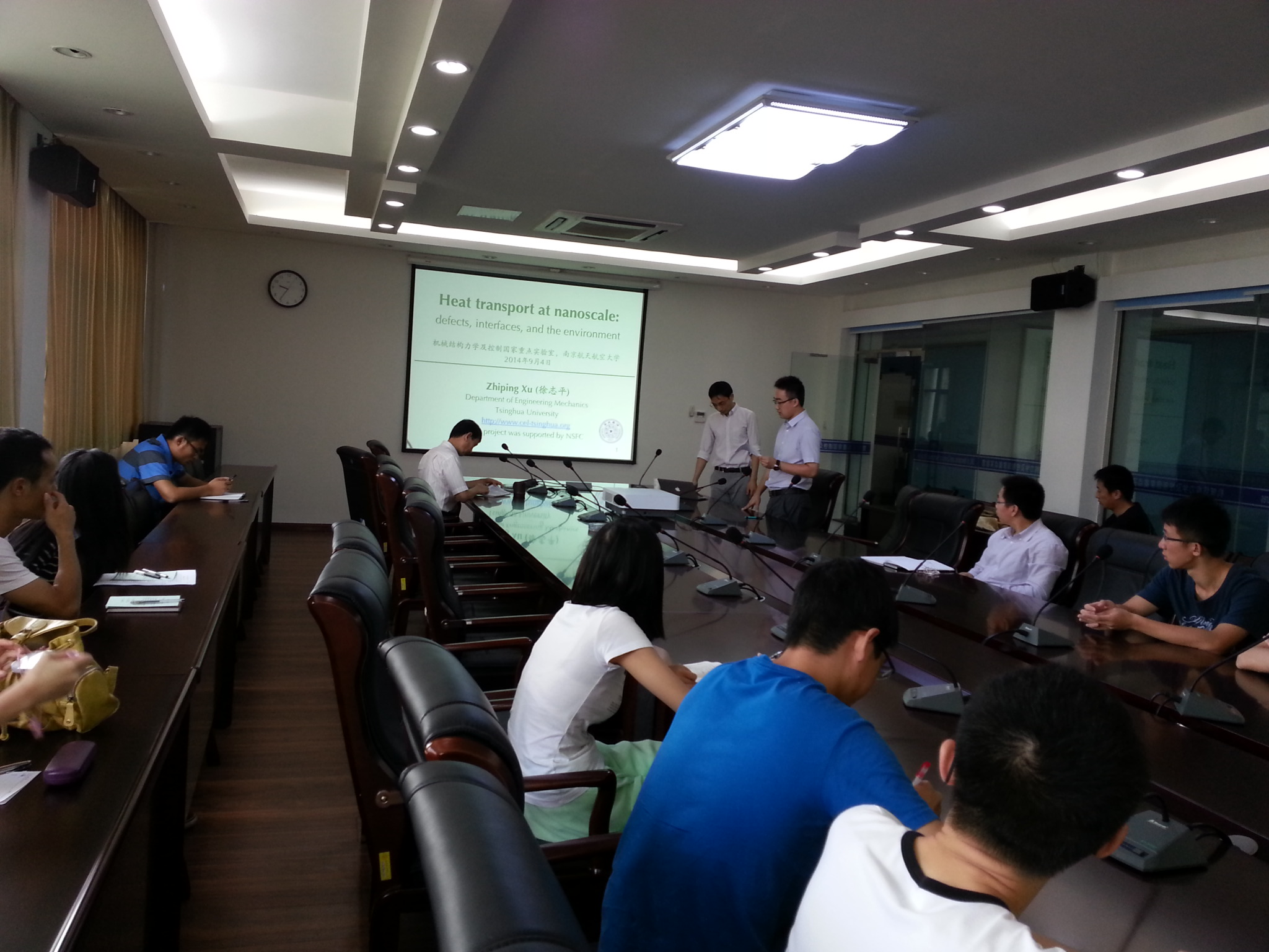 访问期间,徐志平教授为我校师生做了题为“Heat dissipation and transport at interfaces: from molecular junctions to nanoelectronics”的学术报告,讲述了他们课题组最近在纳尺度界面的热扩散和热传导方面的研究进展,并与与会师生的进行了深入的探讨,相关师生受到了许多有益的启发。