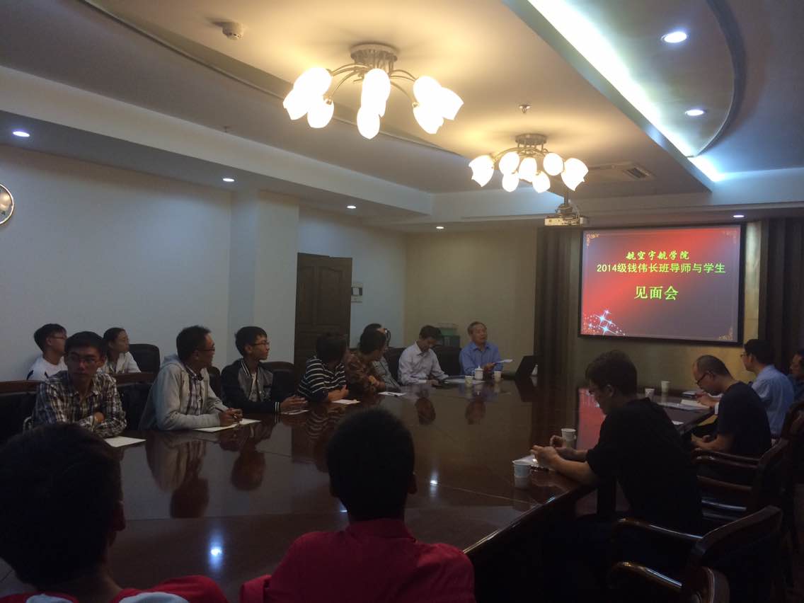 10月12日晚,航空宇航学院在明故宫校区组织了14级钱伟长班导师与学生的第一次见面会。首先,是为钱班配备的我校五位导师与学生的见面会。沈星副院长向同学们一一介绍14级钱伟长班配备的导师。随后,五位导师与同学们进行了分组的交谈,在交谈中导师们询问了同学们的学习生活情况,对同学们有了初步的了解,并留下了自己的联系方式。同学们也纷纷表示希望以后能多和导师们交流,在学习上获得导师们的帮助。在短短的相互交流中,导师和同学们建立了师生情谊。
