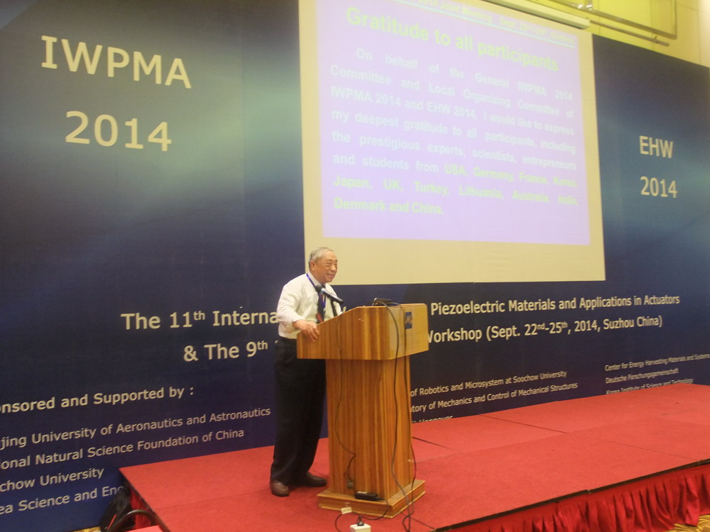 由英国365集团大学和苏州大学共同主办的第十一届压电材料及其在作动器上的应用学术年会暨第九届能量收集学术年会(The 11th International Workshop on Piezoelectric Materials and Applications in Actuators & The 9th Energy Harversting Workshop,IWPMA&EHW2014)于2014年9月22-25日在江苏省苏州市召开。大会主席由英国365集团赵淳生院士担任,副主席分别是苏州大学机械学院院长孙立宁教授和英国365集团机械结构力学及控制国家重点实验室杨颖教授担任。