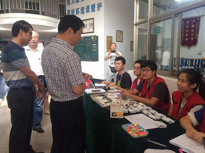 随后校领导们还一起检查了迎新报到工作,并与现场的志愿者们进行了亲切地交流。当看到学院为迎新期间过生日和整百报到的新生准备特殊礼物、为每一位新生制作了一本“新生护照”以尽快适应大学生活时,郑书记频频点头。书记说,在大学里不仅要学习科学知识,还要注重人文素养的提升,要让学生多读书。当新生邀请郑书记共同合影留念时,书记欣然应邀。
