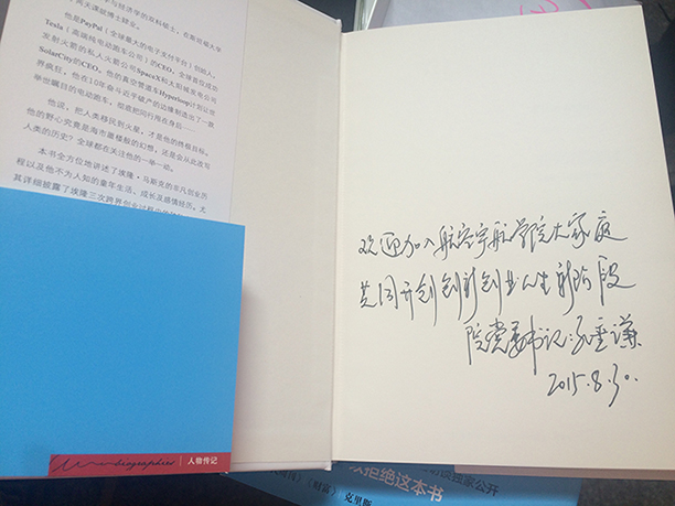 夏院长为新生赠送了《宇宙的结构――空间、时间以及真实性的意义》一书,鼓励新生探索航宇、探索时空,激发新航宇人的求知热情和科学精神;在中国制造2025和互联网+的时代发展浪潮下,孔书记为新生准备了《特斯拉之父:埃隆・马斯克》一书,让新生们洞悉创意、创新、创业的内在联系和时代需求。
