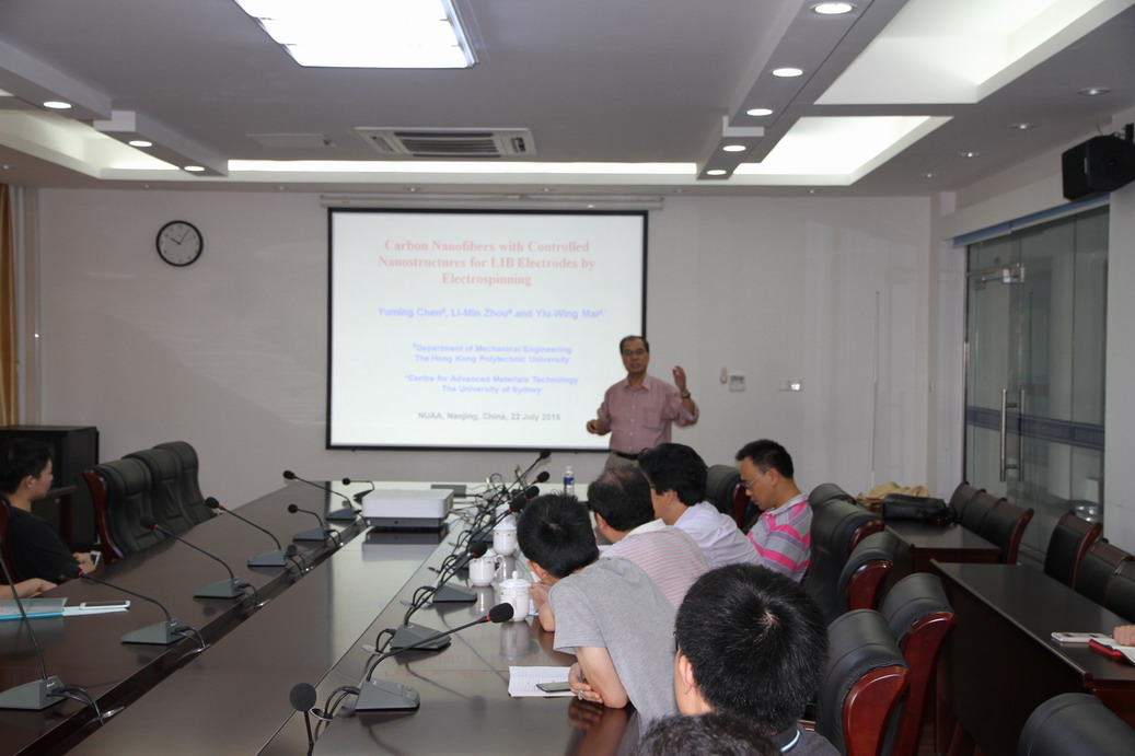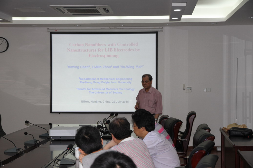 应我校机械结构力学及控制国家重点实验室高存法教授邀请,澳大利亚悉尼大学教授、澳大利亚联邦杰出学者、澳大利亚科学院和工程院两院院士、英国皇家学会外籍院士Yiu-Wing Mai(米耀荣)教授于2015年7月20日至7月25日访问了我校,并于7月22日为我校师生做题为“Carbon Nanofibers with Controlled Nanostructures for LiB Electrodes by Electrospinning”的学术报告。