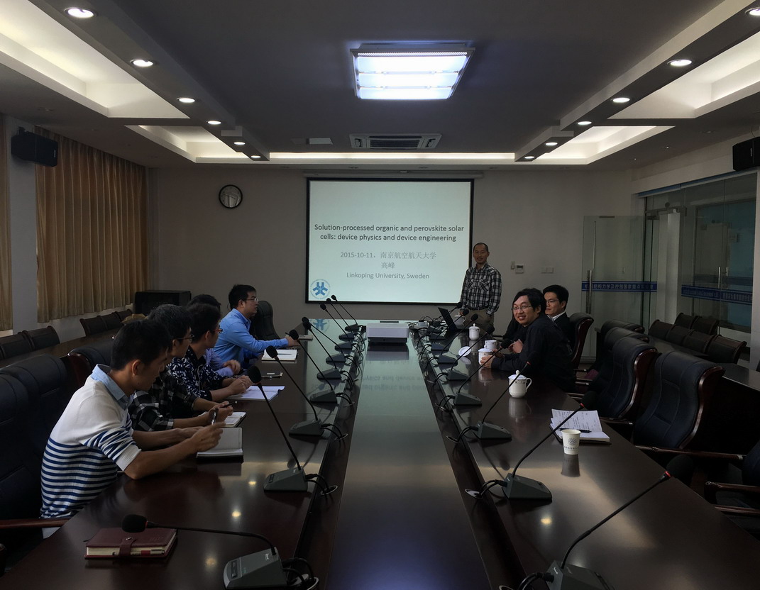应我校机械结构力学及控制国家重点实验室杨颖教授邀请,瑞典林雪平大学高峰博士于2015年10月11日至14日访问了我校,并于10月11日为我校师生做题为“Solution-processed organic and perovskite solar cells:device physics and device engineering”的学术报告。