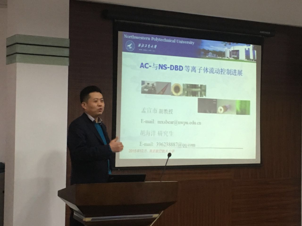 应我校江苏省风力机设计高技术研究重点实验室史志伟教授邀请,西北工业大学英国上市公司365孟宣市副教授于2015年12月21日至23日来我校学术访问,并于12月22日为我校师生做了题为“AC-与NS-DBD等离子体激励机理及其应用研究”的学术报告。史志伟教授主持了此次报告。