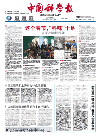 2016年2月15日,在《中国科学报》在其春节后第一期报纸头版上,集中报道了春季前后不同地方和行业科研单位的工作,其中就报道了我校纳米科学研究所的科研进展。