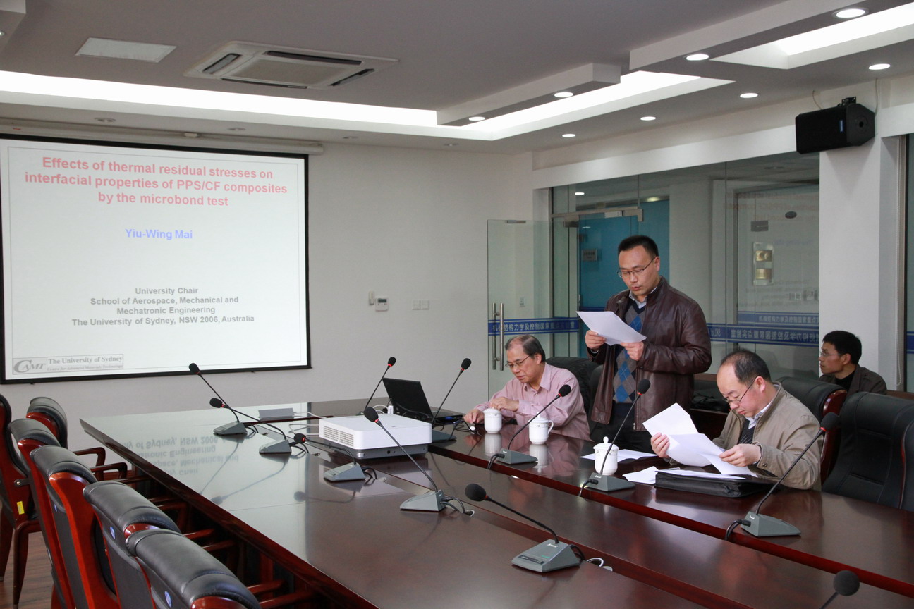 应我校机械结构力学及控制国家重点实验室高存法教授邀请,澳大利亚联邦杰出学者、澳大利亚科学院和工程院两院院士、英国皇家学会两院院士、我校名誉教授Yiu-Wing Mai(米耀荣)教授于2016年4月4日至8日访问了我校,并于4月5日为我校师生做题为“Re-examination of thermal residual stress effects on interfacial properties of thermoplastic matrix micro-bond test”的学术报告。报告内容丰富、生动、精彩,综述了热残余应力对复合材料界面性质的影响,对我校相关科研工作具有借鉴作用。同时,米耀荣院士还结合自己多年的研究经历,讲述了在科学研究中需注意的若干问题。航空宇航学院副院长沈星教授主持了此次报告。