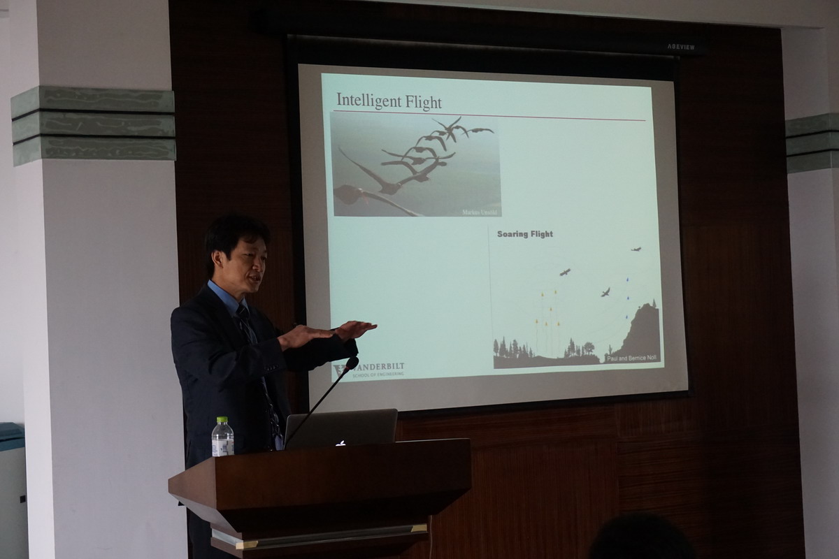 应我校航空宇航学院空气动力学系周春华教授邀请,美国范德堡大学机械工程系Haoxiang Luo副教授于2016年4月27日至28日访问了我校,并于4月27日为我校师生做了题为“Recent lessons from the wings of nature”的学术报告。Luo副教授阐述了鸟和昆虫飞行的空气动力学和弹性力学机理、对飞行器设计的启发,以及其团队在该领域的最新研究成果。报告内容丰富、精彩,对我校相关科研工作具有借鉴作用,参加报告会的师生受益匪浅。同时, Luo副教授还结合自己多年的研究经历,讲述了科学研究的思维、方法和一般规律等若干问题。周春华教授主持了此次报告会。