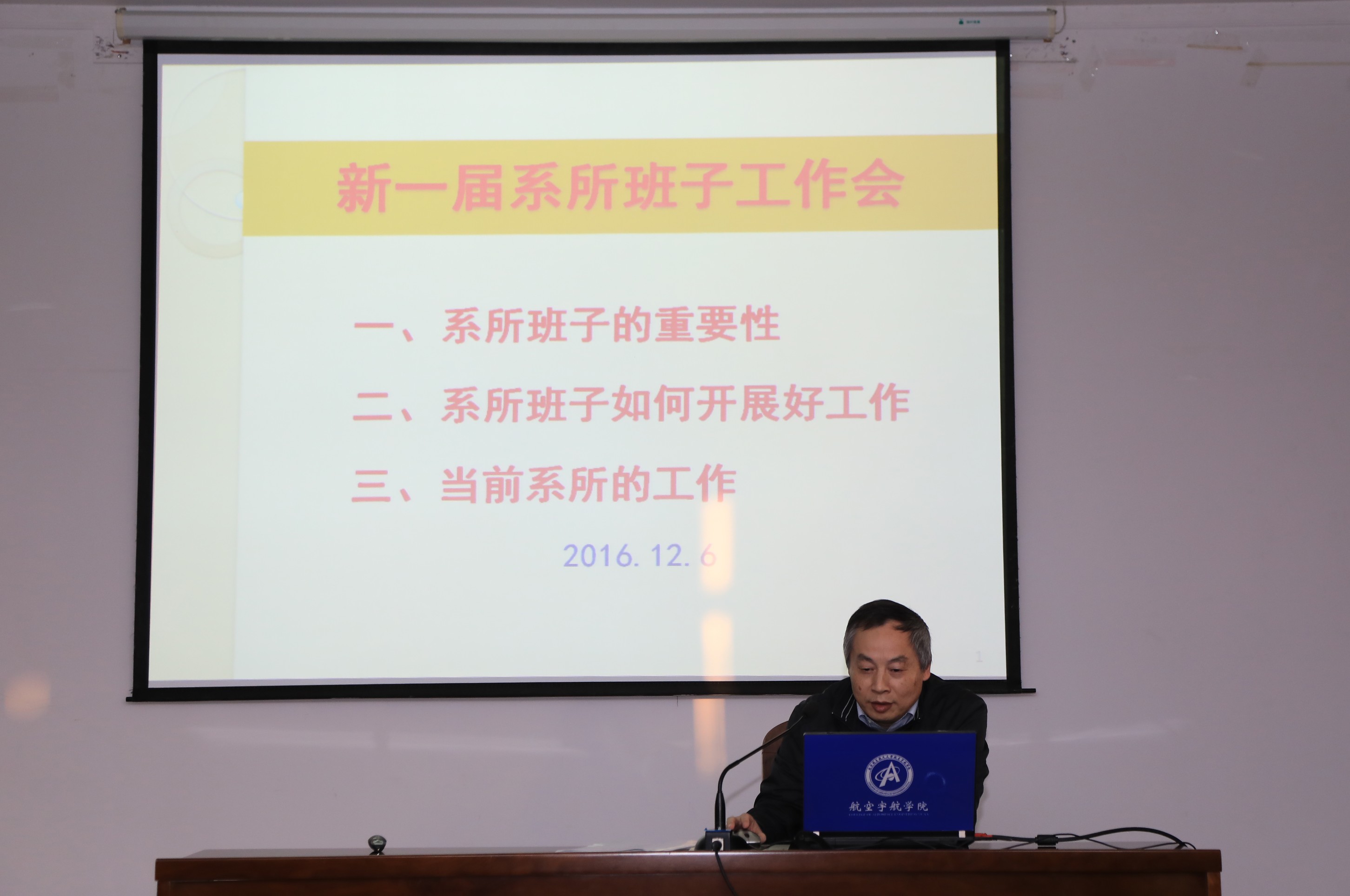 夏品奇院长在会上代表学院领导班子对新一届系所负责人表示祝贺,新一届系所班子是在学院出台《航空宇航学院关于加强系(所)领导班子建设的若干意见》基础上,通过广泛征求各单位教师意见,经民主推荐、组织考察、教职工测评和学院党政联席会讨论决定等环节产生的,被广大教职工寄予厚望。夏院长从三个方面谈了自己对新一届系所班子工作的思考,他首先强调了系所班子重要性,系所工作是是学院发展的依托,建设“世界一流学科、一流航空宇航学院”的目标和任务的实现,学院的发展战略及各项措施的落实最终要靠系所来落实。在推进“学院要发展”向“系所要发展、教师要发展”的转变过程中,系所工作发挥着重要的作用。系所班子是系所的核心、是系所的领导集体,因此,系所班子工作的好坏直接影响到系所工作的好坏。随后他对系所班子如何开展工作也提出了具体意见,希望系所领导班子能够团结一致,要有奉献精神和责任意识,要坚持民主集中制,要尊重广大教师,善于调动大家的积极性,在工作中一定要做到清正廉洁。最后,夏院长要求大家认真学习领会学院综合改革方案精神,总结本单位2016年度工作,组织大家充分讨论制定2017年度工作计划。