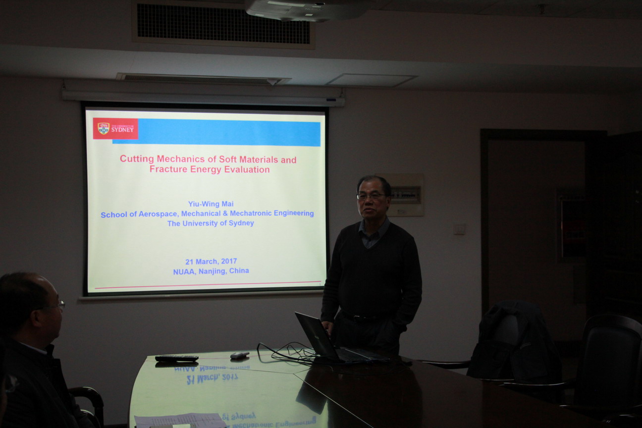 应我校机械结构力学及控制国家重点实验室高存法教授邀请,我校名誉教授、澳大利亚联邦杰出学者、澳大利亚科学院和工程院两院院士、英国皇家科学院和工程院两院院士、澳大利亚悉尼大学航空航天与机械机电工程学院Yiu-Wing Mai(米耀荣)教授及Hong-Yuan Liu博士于2017年3月20日至30日访问了我校,并分别于3月21日、3月29日为我校师生做题为“Cutting Mechanics of Soft Materials � The Role of Fracture Toughness”及“Carbon fibre/epoxy composites toughening by interleaves”的学术报告。报告内容丰富、生动、精彩,分别介绍了断裂韧性在软物质切割力学中的作用及在聚合物复合材料加工制造中的应用,以及采用短纤维薄膜、碳纳米管薄膜等增韧层对碳纤维复合材料结构进行增韧以提高其层间断裂韧性的研究进展,对我校相关科研工作具有非常大的借鉴作用。王立峰教授主持了报告。