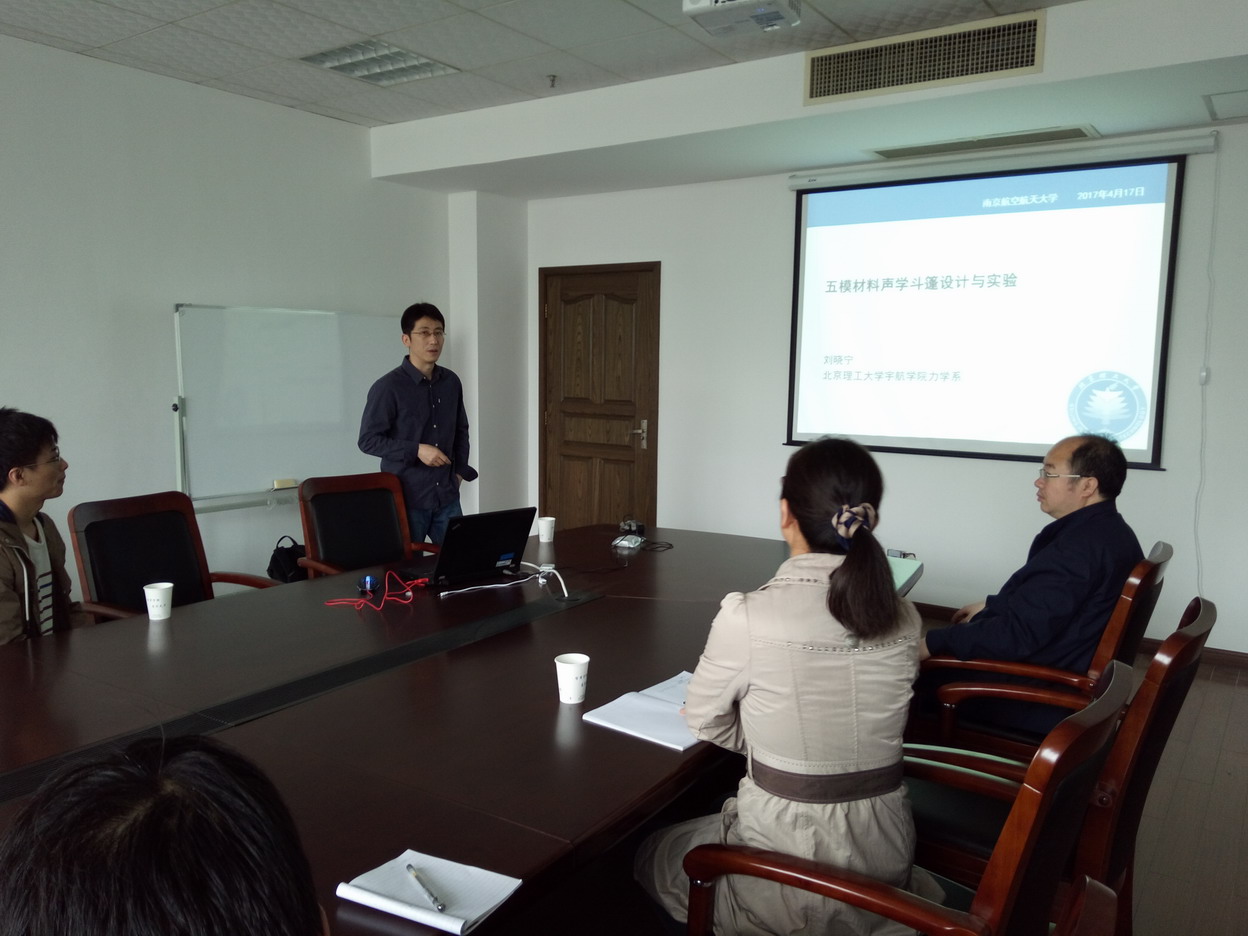 应我校机械结构力学及控制国家重点实验室王立峰教授邀请,北京理工大学刘晓宁副教授于2017年4月15日至18日访问了我校,并于4月17日为我校师生做题为“五模材料声学斗篷的设计与实验研究”的学术报告。报告内容丰富、生动、精彩,介绍了关于基于声学理论设计的一种二维圆柱构型宽频水声隐身斗篷及其实验验证,对我校相关科研工作具有借鉴作用。同时,刘晓宁副教授还结合自己多年的研究经历,讲述了声学超材料的研究进展。王立峰教授主持了此次报告会。