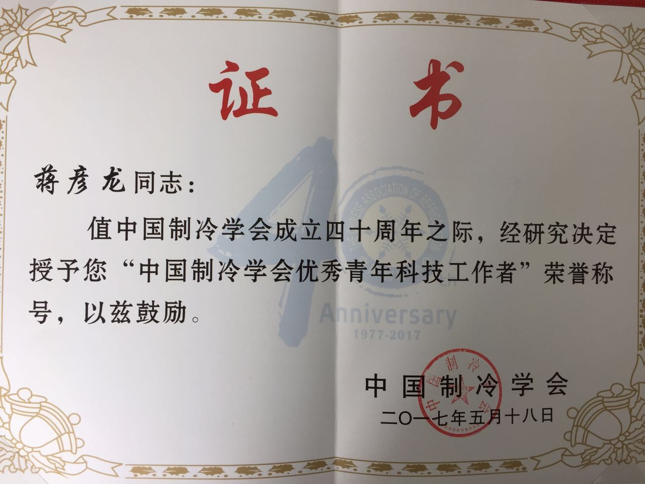 蒋彦龙教授获中国制冷学会优秀青年科技工作者称号