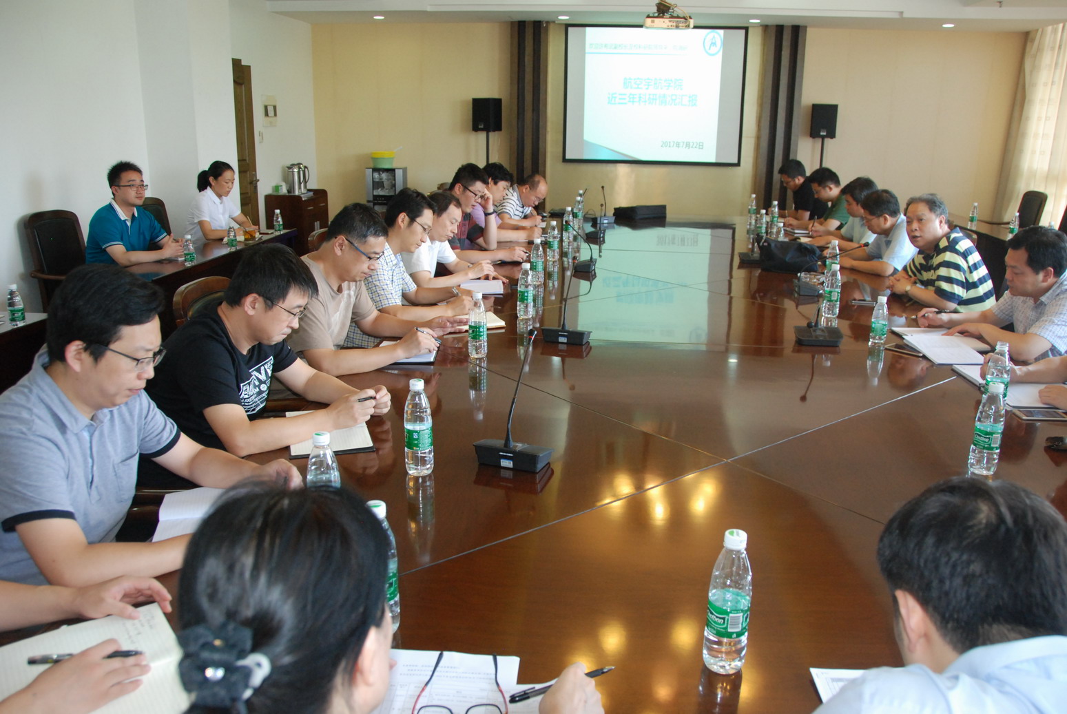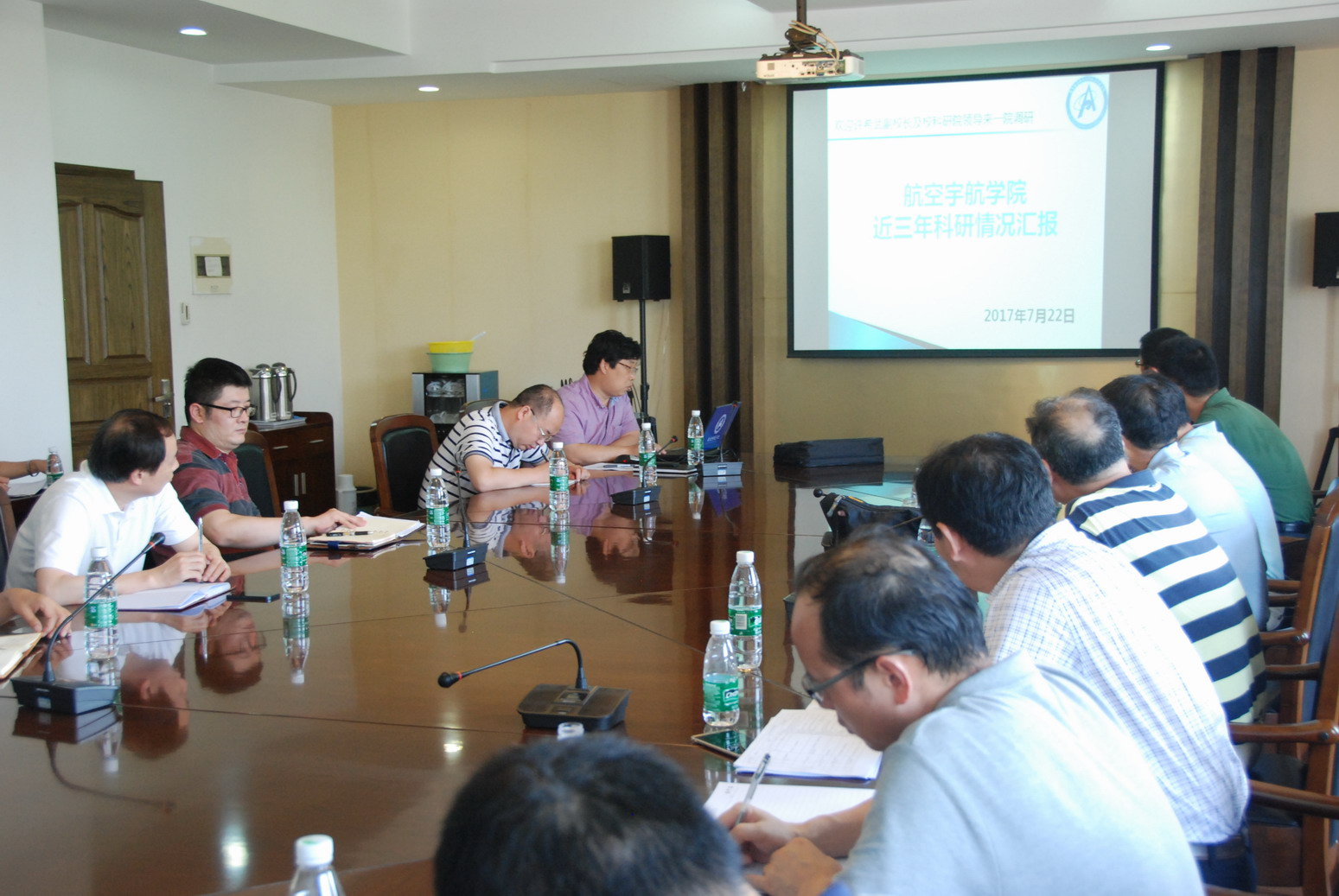 航空宇航学院常务副院长高存法汇报了近三年学院科研到款、重大项目、科研成果、科研平台建设情况、改进措施及近期工作安排等。