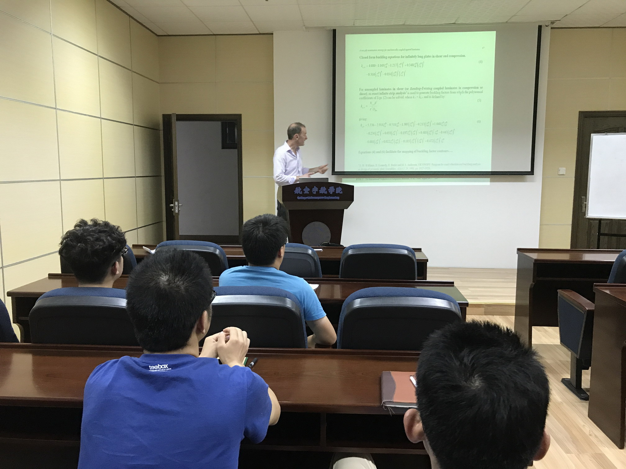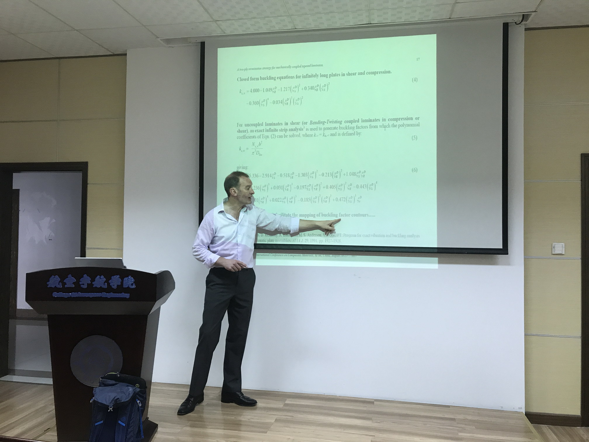 应我校航空宇航学院航空航天交叉研究院郭玉杰老师邀请,英国格拉斯哥大学Christopher Bronn York副教授,于2017年8月21日至9月1日访问了我校,并于8月30日为我校师生做了题为“Effect of bending-twisting coupling on the compression and shear buckling strength of infinitely long plates”的学术报告。报告内容丰富、生动、精彩,介绍了复合材料结构设计中的前沿研究工作,对我校相关科研工作具有借鉴作用。同时,Christopher Bronn York副教授还结合自己多年的研究经历,讲述了复合材料以及复合材料制造技术的发展历史等。郭玉杰老师主持了此次报告会。