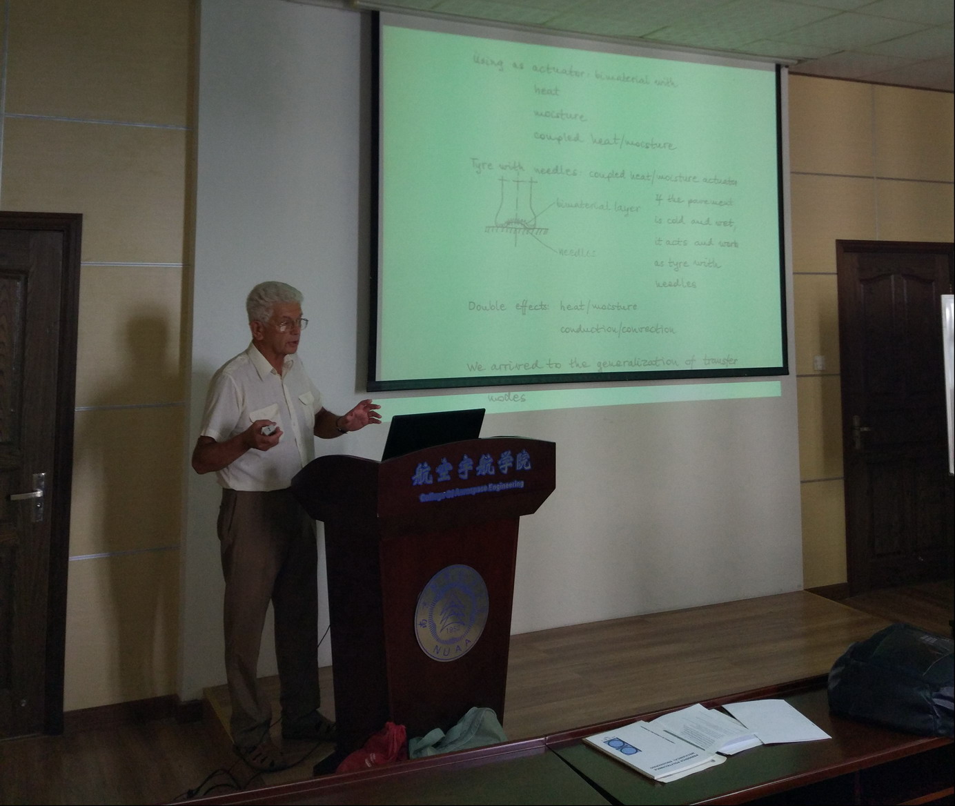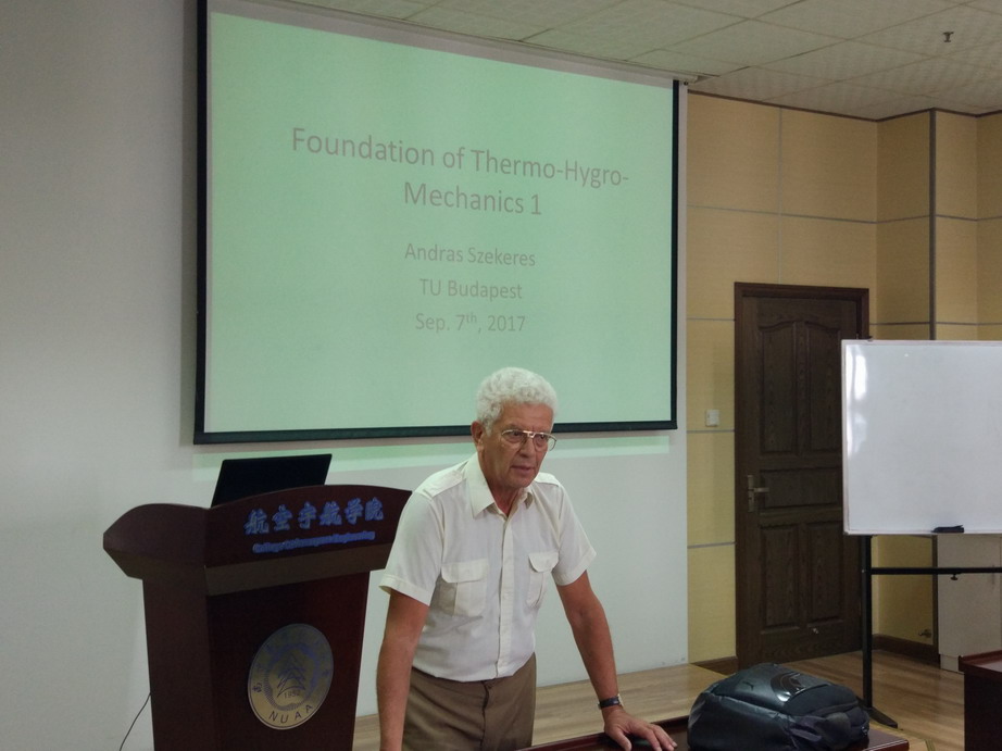 应我校航空宇航学院机械结构力学及控制国家重点实验室高存法教授邀请,匈牙利布达佩斯技术与经济大学Andras Szekeres研究员于2017年9月5日至19日访问了我校,并于9月7日至18日为我校师生做了题为“Foundation of Thermo-Hygro-Mechanics: A series reports”的系列学术报告。报告从理论起源,基本求解方法,工程应用和科研课题探讨等几个方面介绍了在复杂“温度-湿度-机械加载”作用下的热-湿-气-力耦合问题,着重探讨了温度感应涂层(Thermal sensitive coating)在航空航天、海洋通信、生物医疗器件等领域的应用,对我校相关科研工作具有借鉴作用。同时,Andras Szekeres博士还结合自己多年的研究经历,讲述了近年来匈牙利以及欧洲科学界在热-湿-气-力耦合问题这一研究方向的科研进展情况等。