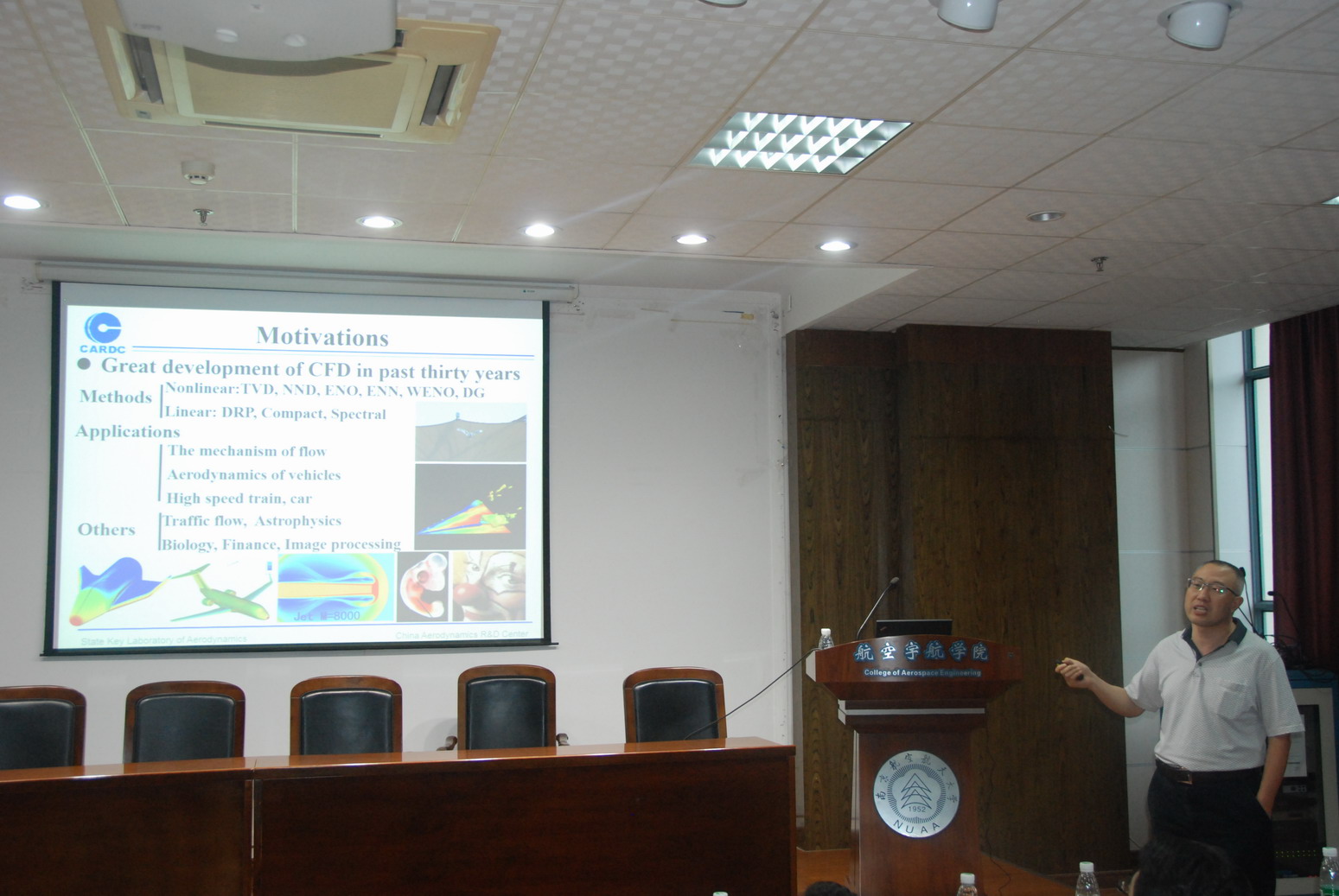 应我校航空宇航学院直升机旋翼动力学国家级重点实验室招启军教授邀请,中国空气动力研究与发展中心、空气动力学国家重点实验室张树海研究员于2017年9月26日至28日访问了我校,并于9月27日为我校师生做了题为“针对计算气动声学的高阶精度高分辨率数值格式及其应用”的学术报告。报告介绍了针对气动声学计算所做的一些工作,包括基本消除了WENO格式计算定常激波问题时在激波下游出现的微弱的非物理波动,发展了类谱分辨率的高阶精度紧致格式,采用这些格式,对一系列旋涡主导的流动噪声进行了直接数值模拟,分析了气动噪声产生机制,内容丰富、生动、精彩,对我校相关科研工作具有借鉴作用。同时,张树海研究员还结合自己多年的研究经历,讲述了科研过程中的一些心得体会。高存法教授主持了报告会。