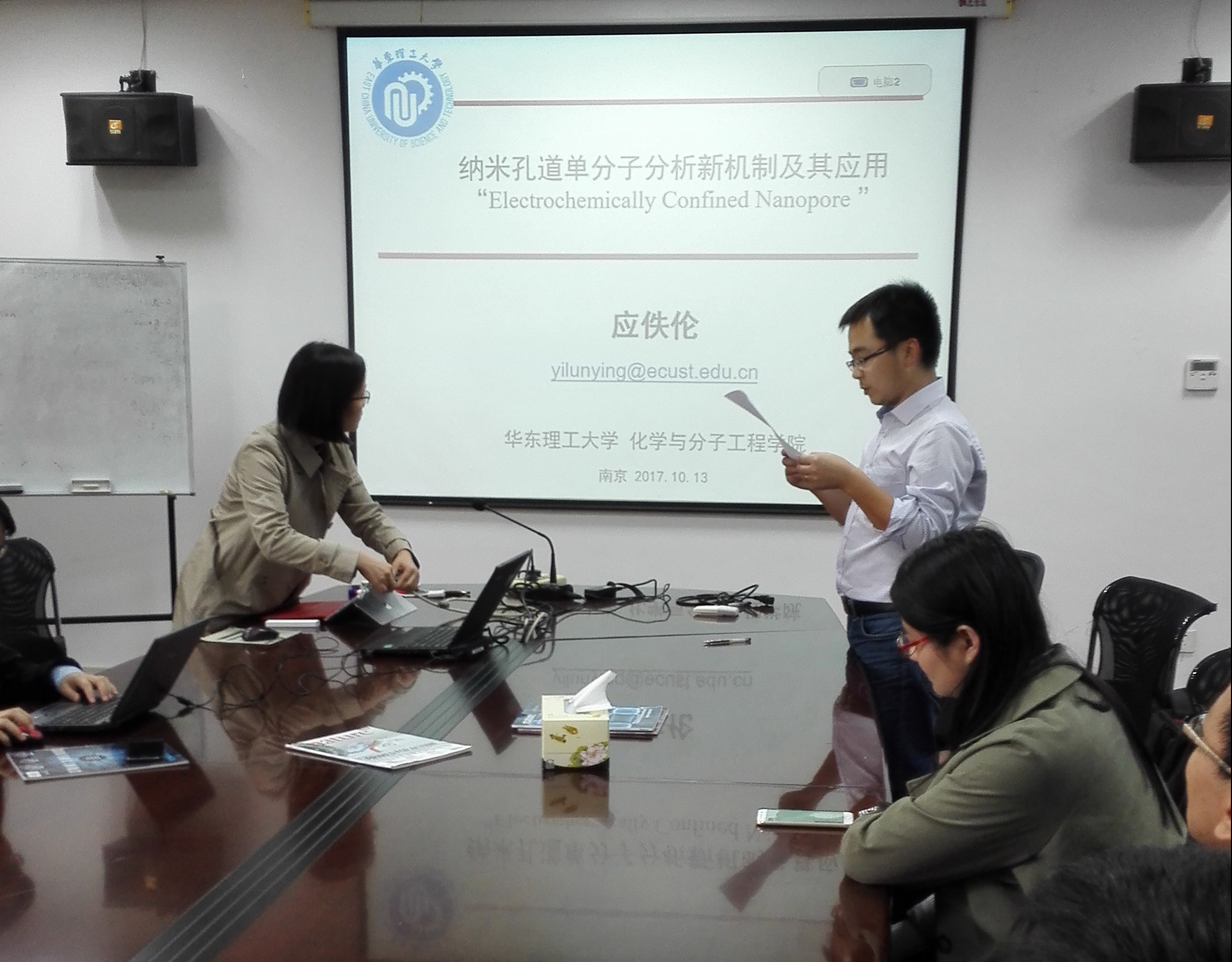 应我校航空宇航学院机械结构力学及控制国家重点实验室仇虎副研究员邀请,华东理工大学应佚伦副研究员于2017年10月13日访问了我校,并为我校师生做了题为“纳米孔道单分子分析新机制及应用”的学术报告。报告介绍了新型生物纳米通道、贵金属纳米孔道和纳米通道电极及相应电化学检测系统的构建;纳米通道用于单分子检测的典型应用。报告内容丰富、生动、精彩,对我校相关科研工作具有借鉴作用。同时,应佚伦博士还结合自己多年的研究经历,与现场听众分享了纳米通道单分子检测领域的研究心得和体会。仇虎副教授主持了报告会。