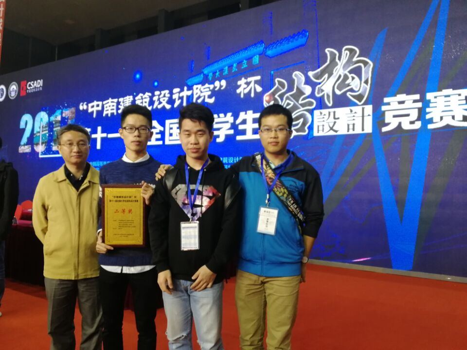 10月18-22日,由中国高等教育学会工程教育专业委员会、高等学校土木工程学科专业指导委员会、中国土木工程学会教育工作委员会和教育部科学技术委员会环境与土木水利学部共同主办的2017第十一届全国大学生结构设计竞赛在武汉大学举行。我校派出了由张耘、叶泽华和徐海斌三位同学组成的代表队参赛,领队为程晔老师,指导教师为唐敢、王法武老师。在经过激烈比拼后获得二等奖,在108支参赛队伍中排名第22位。