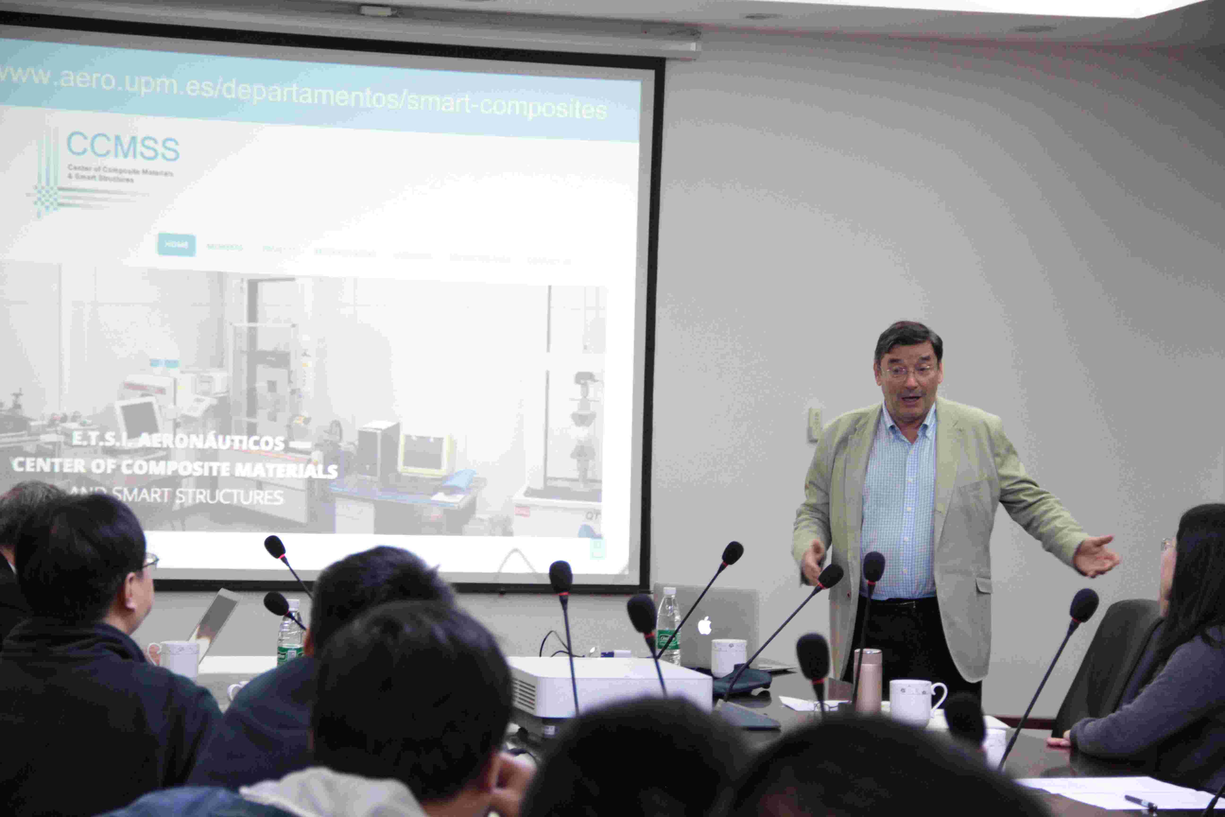 应我校机械结构力学及控制国家重点实验室袁慎芳教授和邱雷教授的邀请,西班牙马德里理工大学Alfredo Guemes教授于2017年11月11日至14日来我校进行了学术访问,并于11月13日上午为我校师生做了题为“R&D at the Polytechnic University of Madrid related to Structural Monitoring with Fiber Optic Sensors”的学术报告。报告介绍了基于光纤传感器的结构健康监测技术原理及应用,内容丰富、生动、精彩,对我校相关科研工作具有借鉴作用。同时,Alfredo Guemes教授还结合自己多年的研究经历,讲述了在光纤传感器其应用过程中的研究体会,并分享了其所在马德里理工大学结构健康监测研究小组的学术成果与经验。钱征华教授主持了此次报告会。