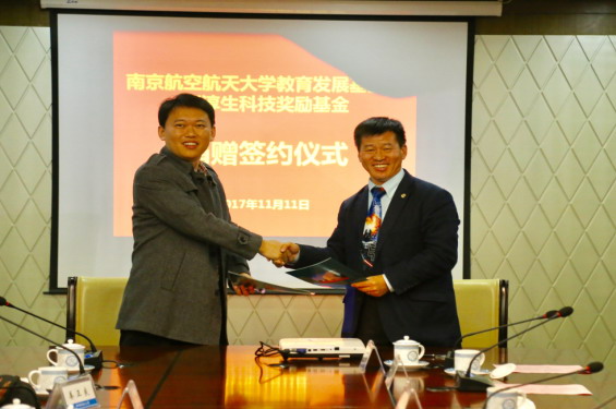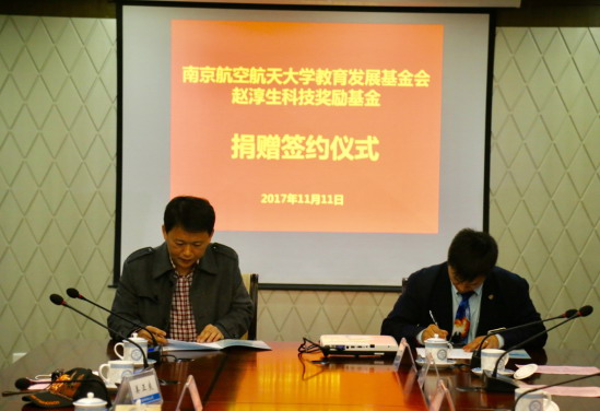 2017年11月11日下午,赵淳生科技奖励基金捐赠签约仪式在我校明故宫校区综合楼920会议室举行。威海克莱特菲尔风机股份有限公司、江苏加德绿色能源有限公司、南京航大超控科技有限公司三家公司负责人作为捐赠单位代表出席了捐赠签约仪式,我校校长助理、机械结构力学及控制国家重点实验室主任熊克教授、中科院院士赵淳生教授、发展联络部部长闾浩、航空宇航学院部分教师代表出席了捐赠签约仪式。仪式由发展联络部副部长张钟勤主持。