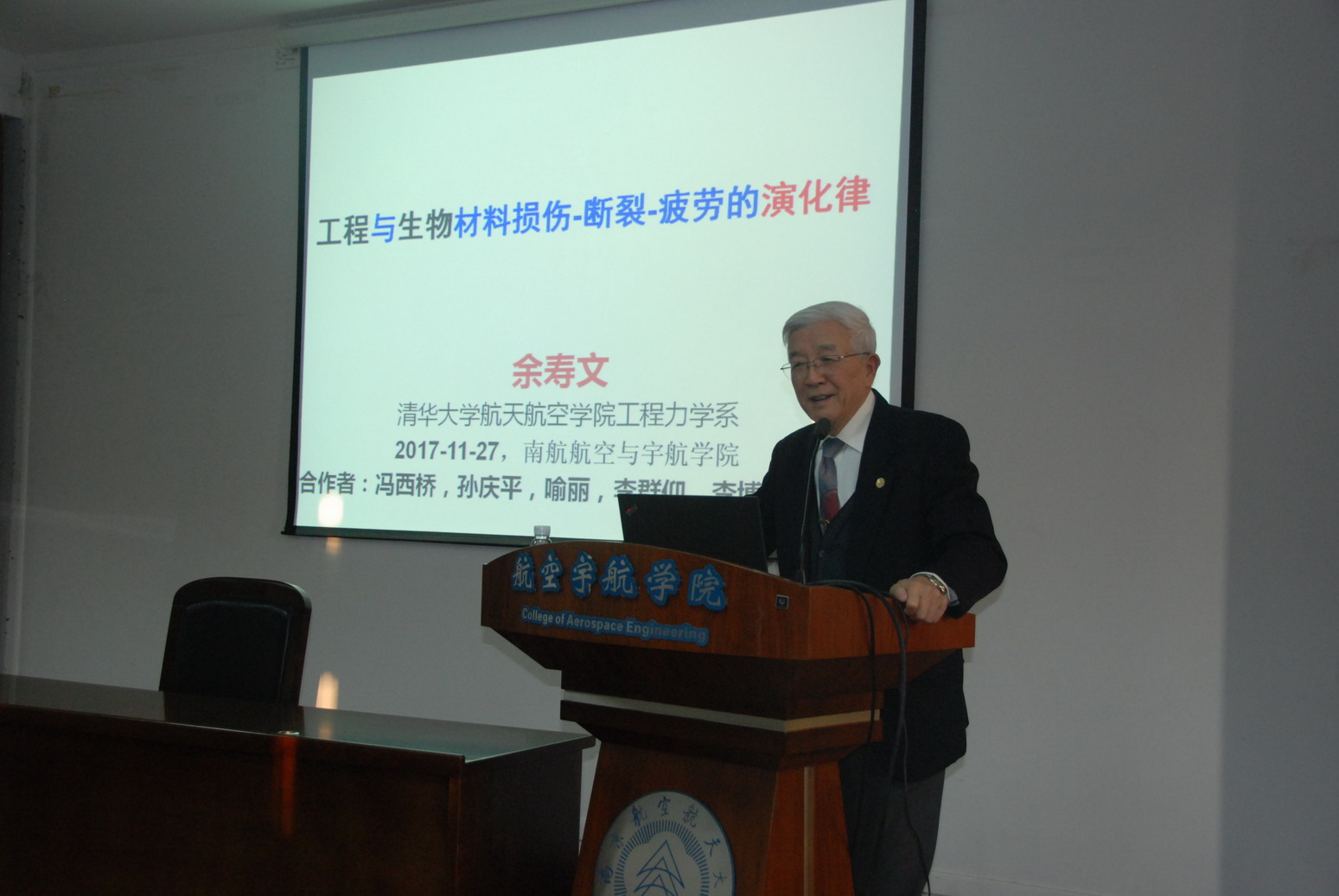 应我校航空宇航学院机械结构力学及控制国家重点实验室高存法教授邀请,清华大学原副校长余寿文教授于2017年11月27日至29日访问了我校,并于11月27日为我校师生做了题为“工程与生物材料损伤-断裂-疲劳的演化律”的学术报告。报告介绍了包括金属、岩石等传统材料以及生物材料的疲劳失效机理。报告内容丰富、生动、精彩,对我校相关科研工作具有借鉴作用。同时,余寿文教授还结合自己多年的研究经历,与现场听众分享了断裂力学及其与生物力学相结合的研究心得和体会。高存法教授主持了报告会。