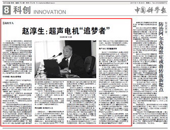 2017年11月28日,《中国科学报》“高校学人”栏目刊发我校赵淳生院士在超声电机领域开拓创新、不断创业的先进事迹报道,集中展现了赵淳生热爱祖国、瞄准前沿、转型创新、不屈不挠的精神品质和感人事迹。