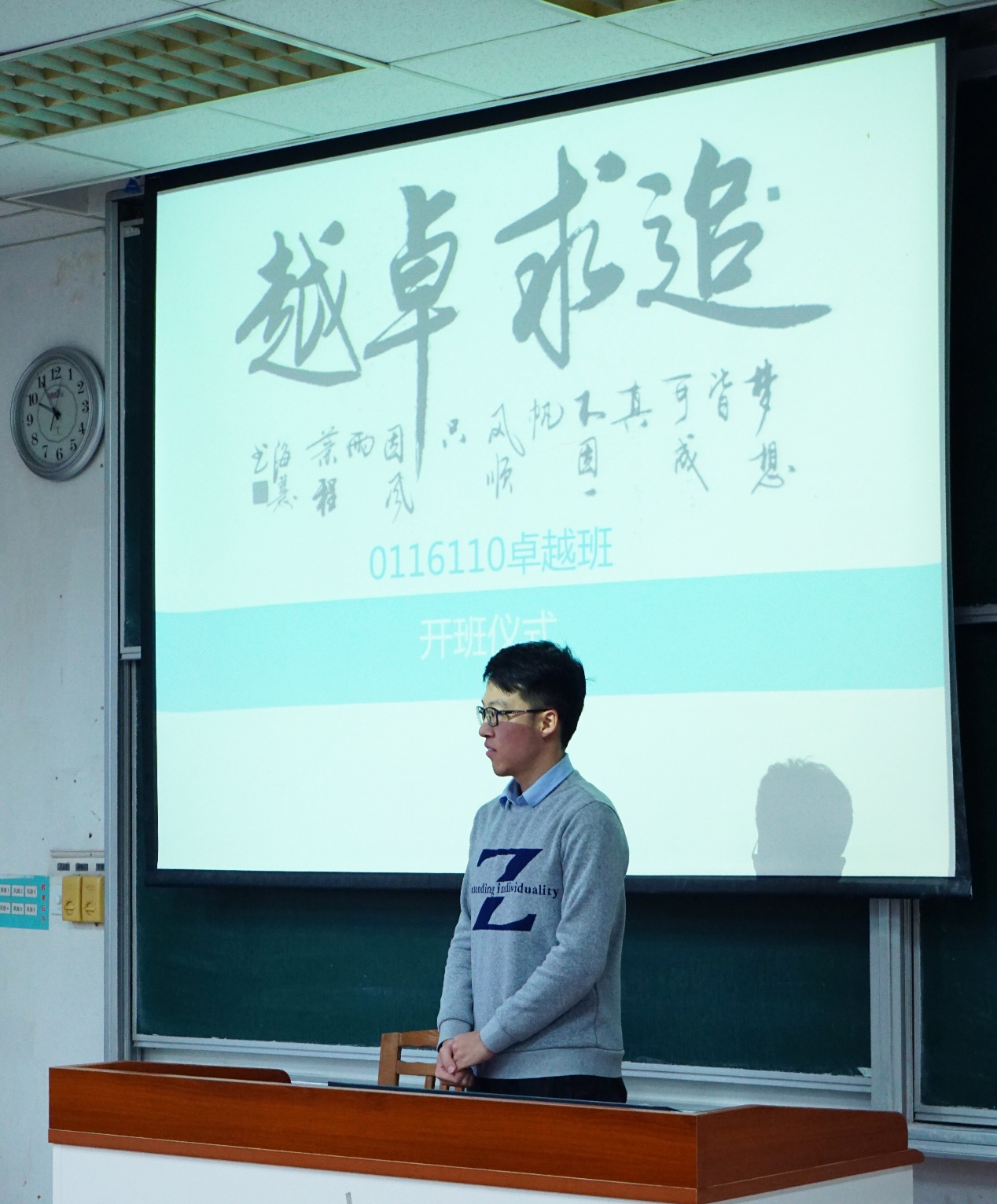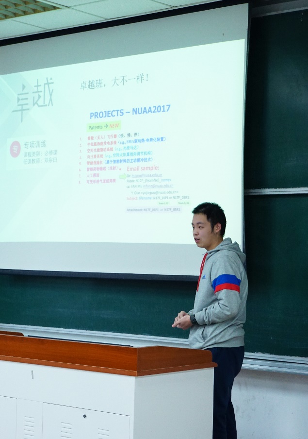 典礼由班长孙世杰主持,首先是卓越计划专业负责人郑祥明老师介绍了卓越计划培养方案和培养要求,提出采用专业知识学习与工程实践能力相结合的培养方案,培养出一批具有良好科学素养,丰富的社会知识和熟练专业技能的实用型人才,并期许大家成为集创新能力、自学能力和决策能力为一体的航空航天事业的建设者和开拓者。