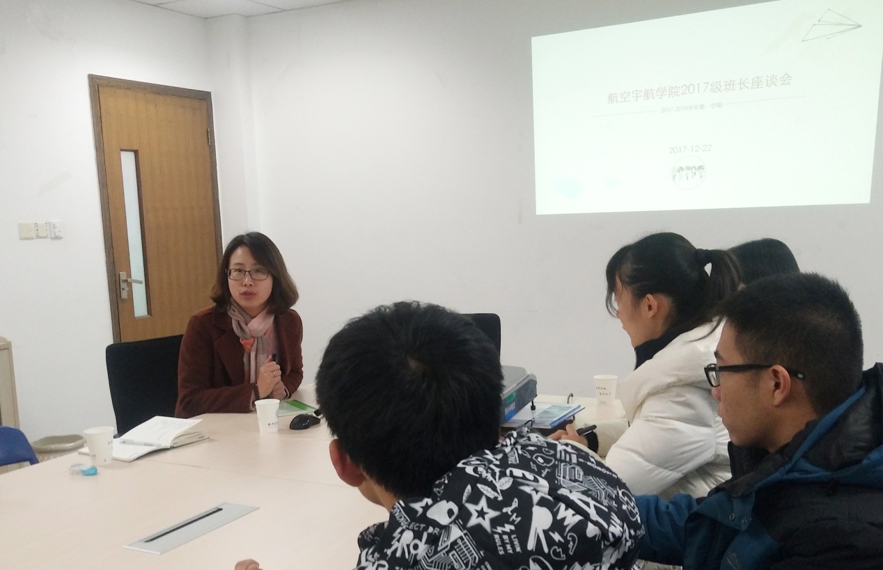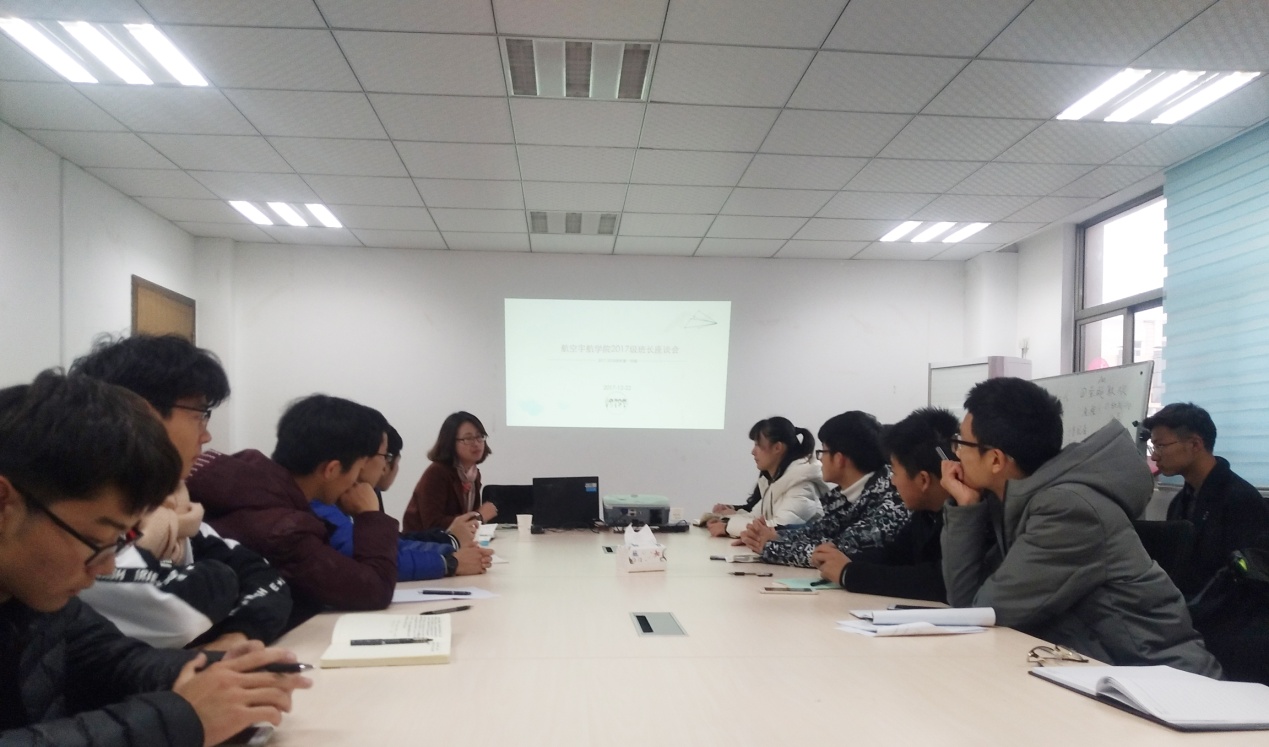 12月22日下午,航空宇航学院在将军路校区学工楼210会议室召开了2017级本科生班级建设座谈会。党委副书记许静、辅导员宗思雨、吴静文、年级团总支书记、2017级各班班长参与座谈。
