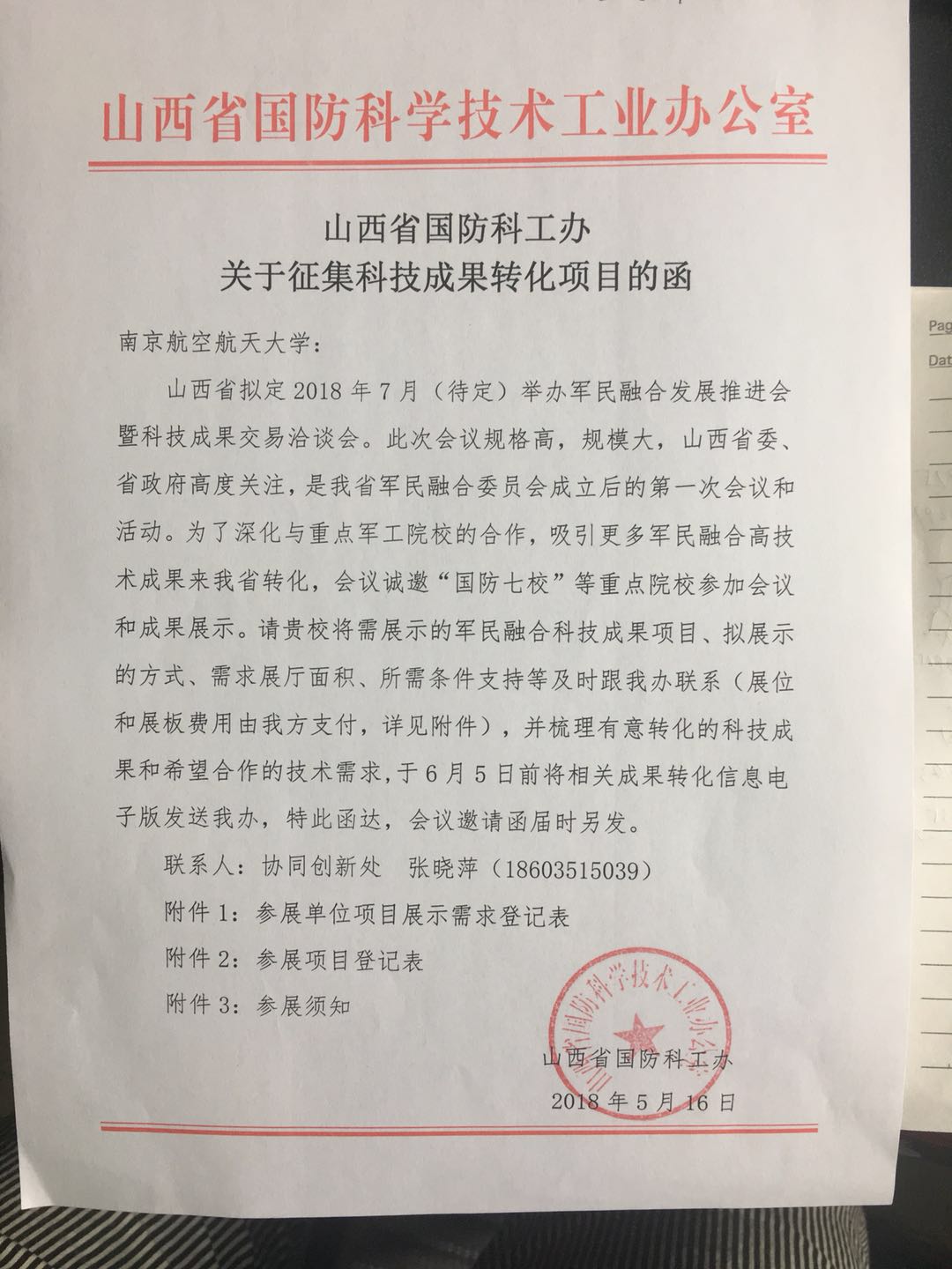 山西省拟定在2018年7月举办发展推进会,届时工信部7所高校将参加此次成果展示会,欢迎学院老师积极报送可以展示的科技成果(不得涉密)。于6月1号下班前,填写好“参展项目登记表”发送至 hxliu@nuaa.edu.cn 并请抄送一份发至 duqian@nuaa.edu.cn